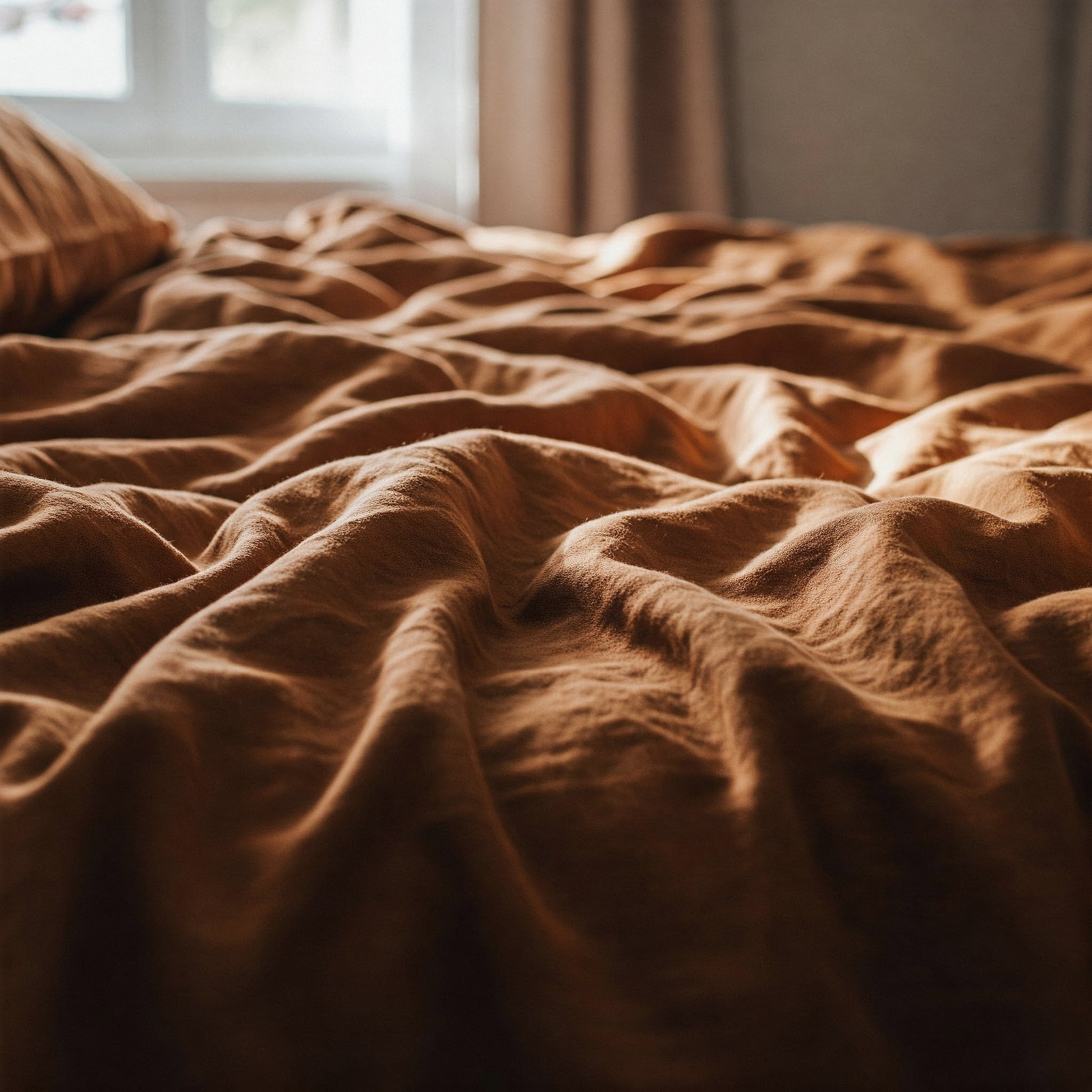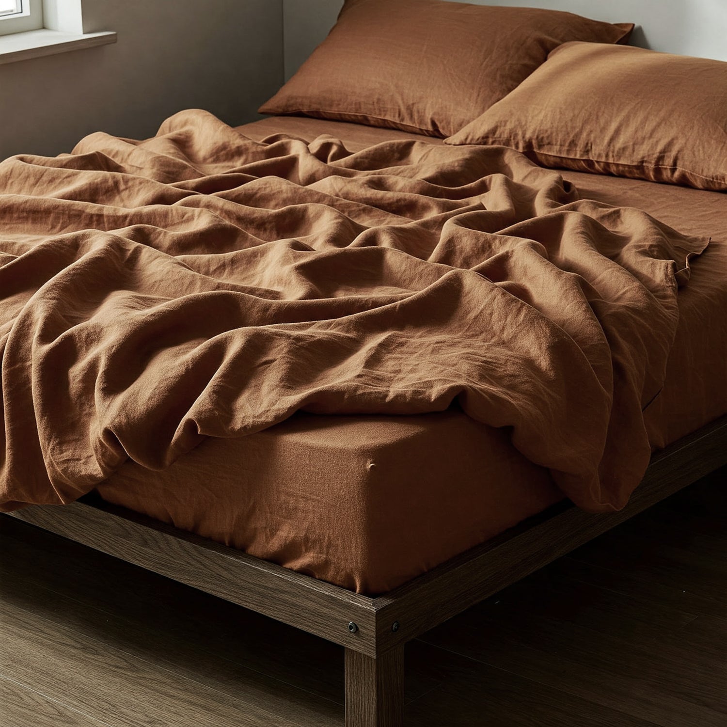 Juego de sábanas de 100% lino color teja rustic , lino lavado. Una elección muy buena para combinar con una funda nórdica del mismo tono teja o ideal para verdes, naturales, negros...