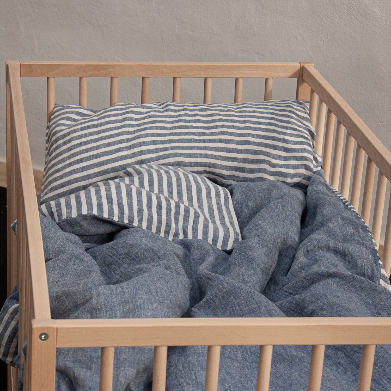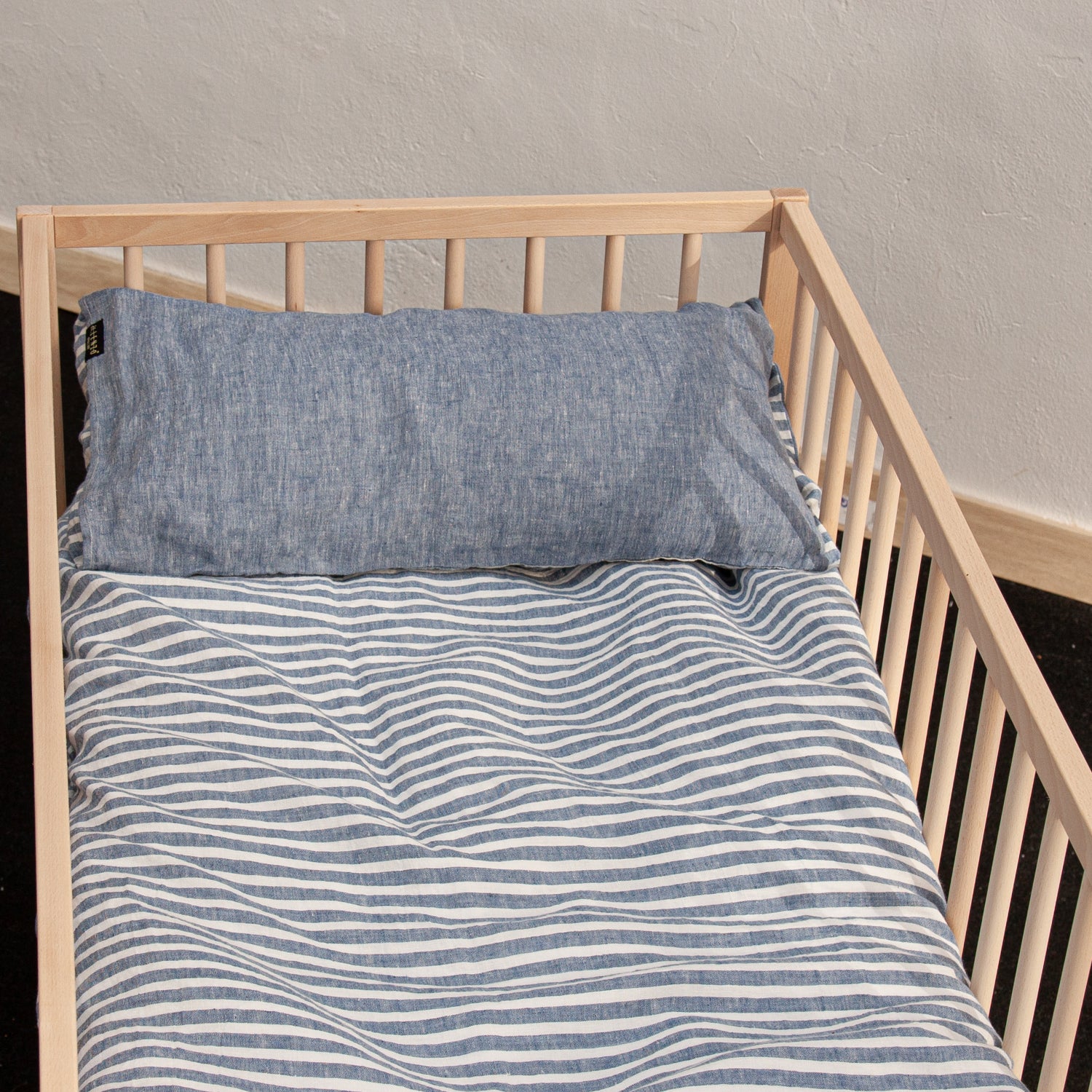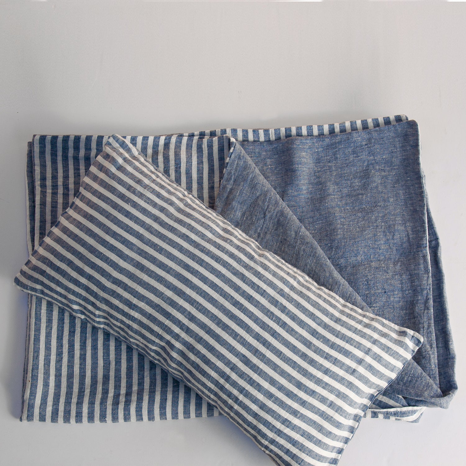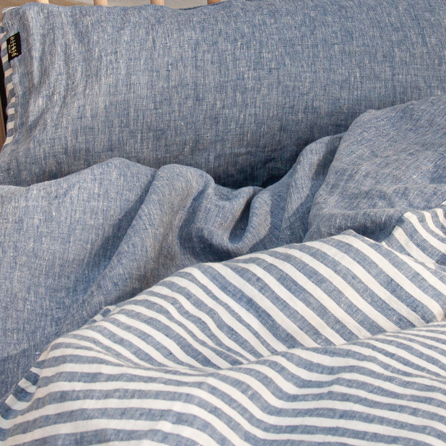 Nuestra funda nórdica Hansel es un dos en uno; azul por un lado y rayadito por el otro. Podrás decidir lo que más te guste. Un lino ideal para niños por su suavidad.La funda nórdica lleva el relleno de fibra hueca incluido y además una funda de almohada a juego.