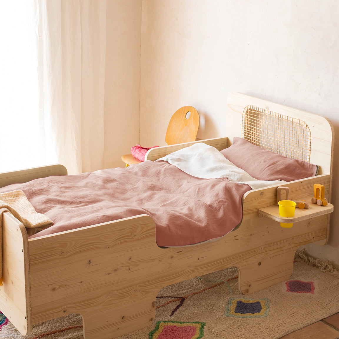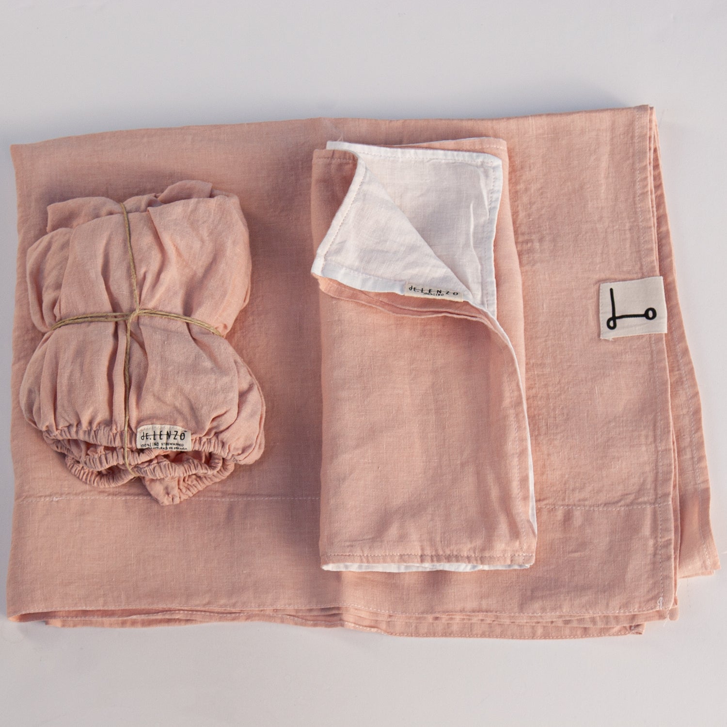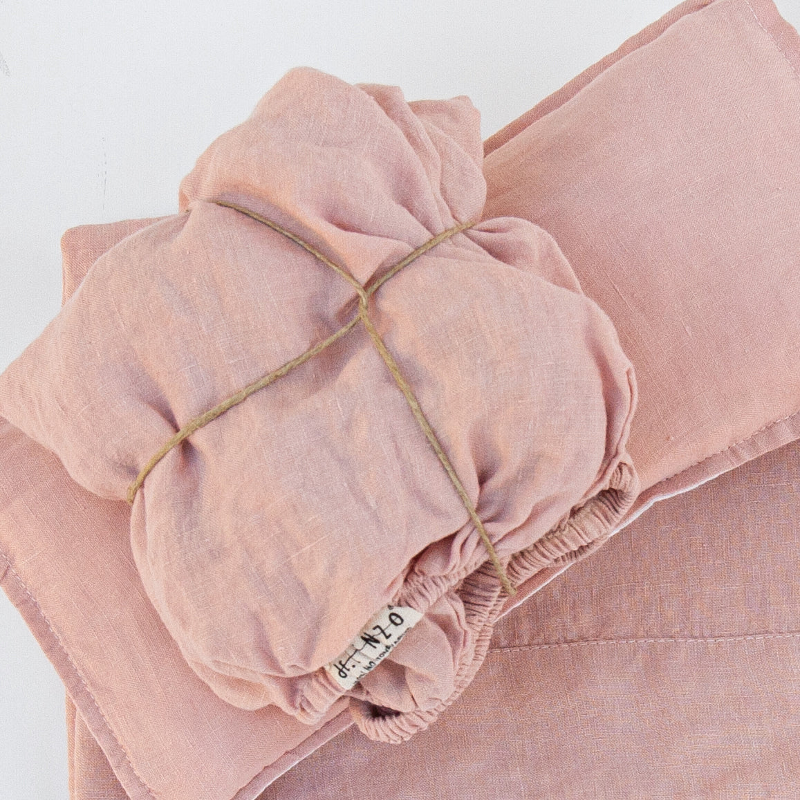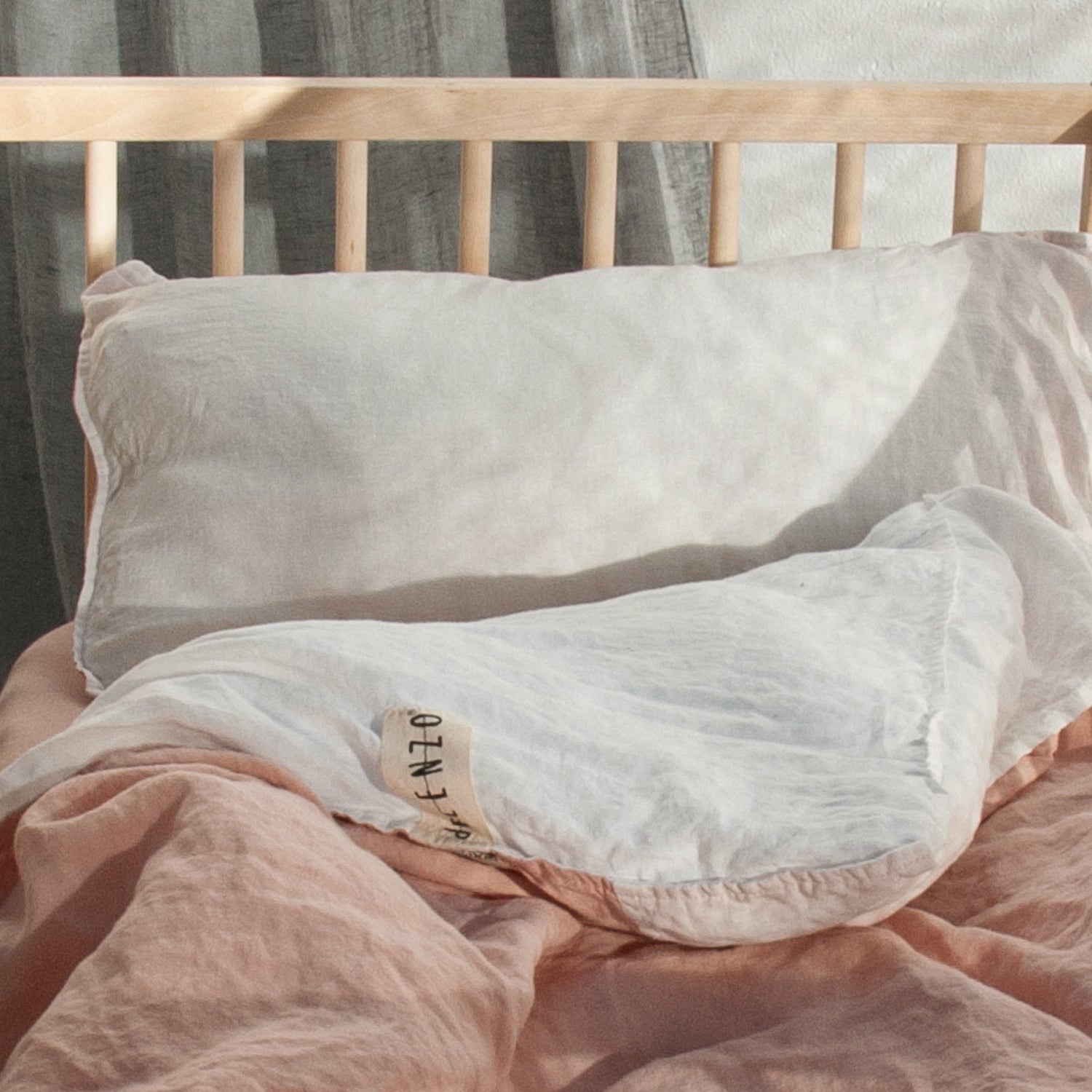 Nuestra funda nórdica Mafalda puede ser verde o rosa empolvado. Ambas están combinadas con blanco. Hechas de 100% lino, no necesitan planchado. El lino de un gramaje medio ( 170gr) es ideal para los más pequeños por su gran transpirabilidad. La funda de almohada lleva el relleno de fibra hueca incluido. En el juego completo (funda nórdica, bajera y almohada) la bajera es rosa como la funda nórdica.