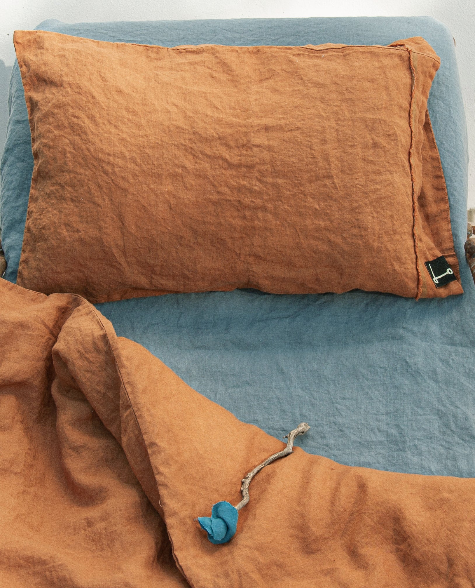El color teja, es de nuestros preferidos. Ideal para combinar con madera. Acabada con flequitos, le da un toque personal a tu funda nórdica. Puedes ponerle una bajera a juego o elegir una bajera azul del mismo tipo de lino. El lino de un gramaje medio (180gr) es ideal para los más pequeños por su gran transpirabilidad. La funda de almohada lleva el relleno de fibra hueca incluido. En el juego completo (Funda nórdica + bajera + almohada) puedes elegir la bajera teja o azul. Anótalo en notas.