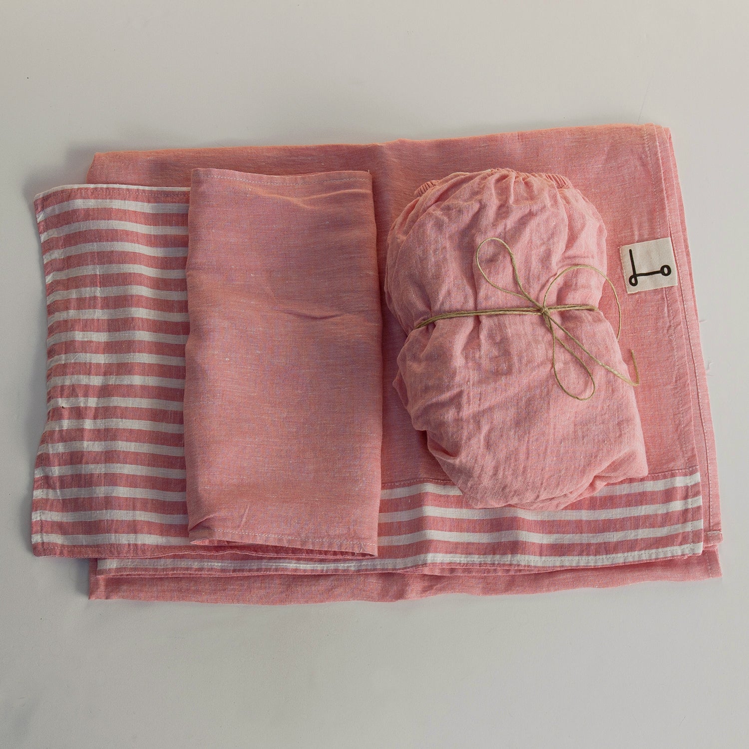 El juego de sábanas incluye una funda de almohada todo 100% lino lavado. Nos chifla el color rosa chicle que tiene el modelo Gretel. La encimera es rosa y tiene un jaretón a rayas a juego con la funda de almohada (que es bicolor)....¡Un sueño de sábanas!
