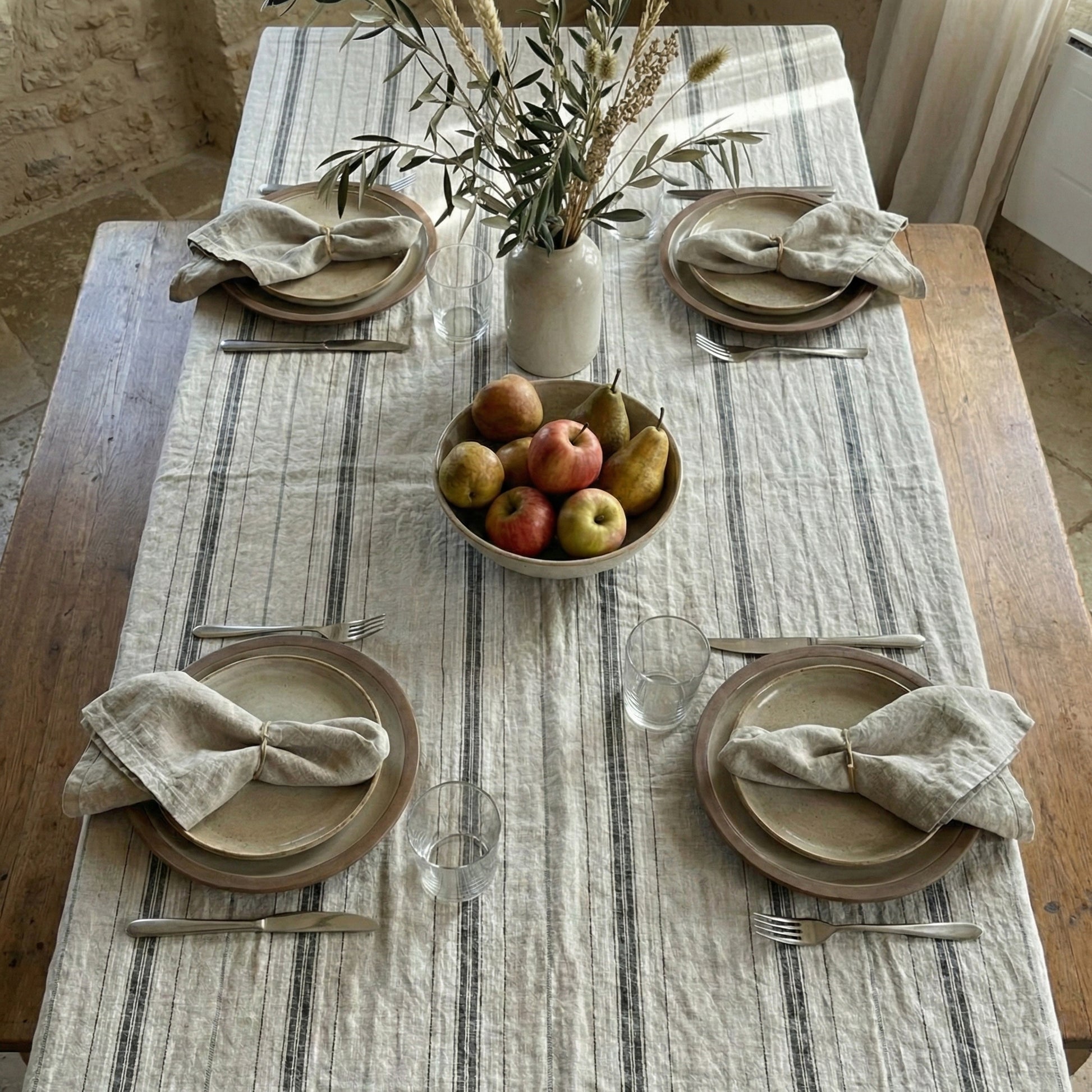 Washed linen tablecloth 240gr/m2, combining 3 colors; Black, natural and white. Made with a soft and warm linen, very easy to combine! Don't forget thatwe can make any size. You can combine it with the black stripes or Marrakech napkins. Add the muletón to protect your table and give body and flight to the tablecloth.