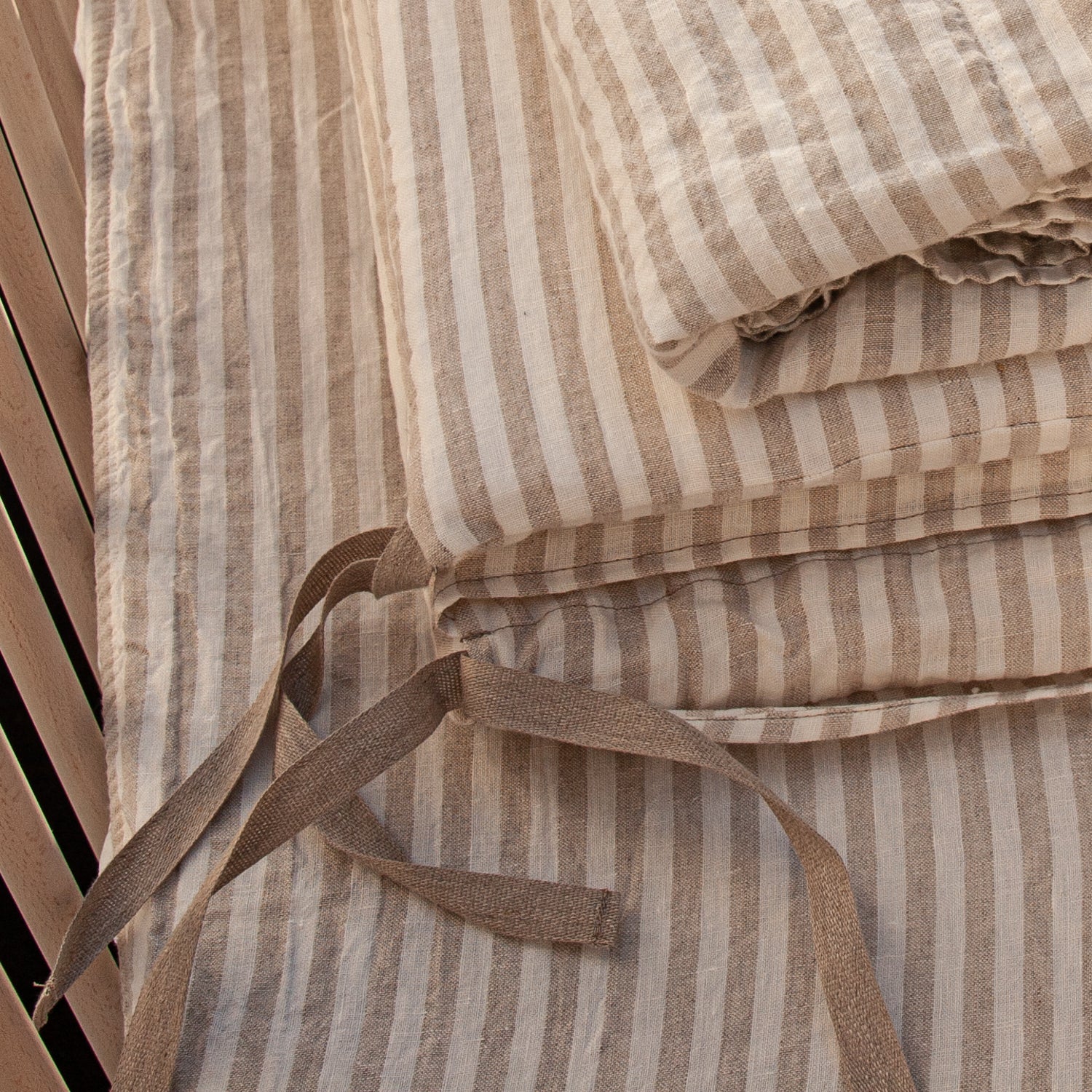 • Juego de sábanas: Bajera y encimera rayaditas y funda de almohada bicolor blanca y a rayas naturales.
