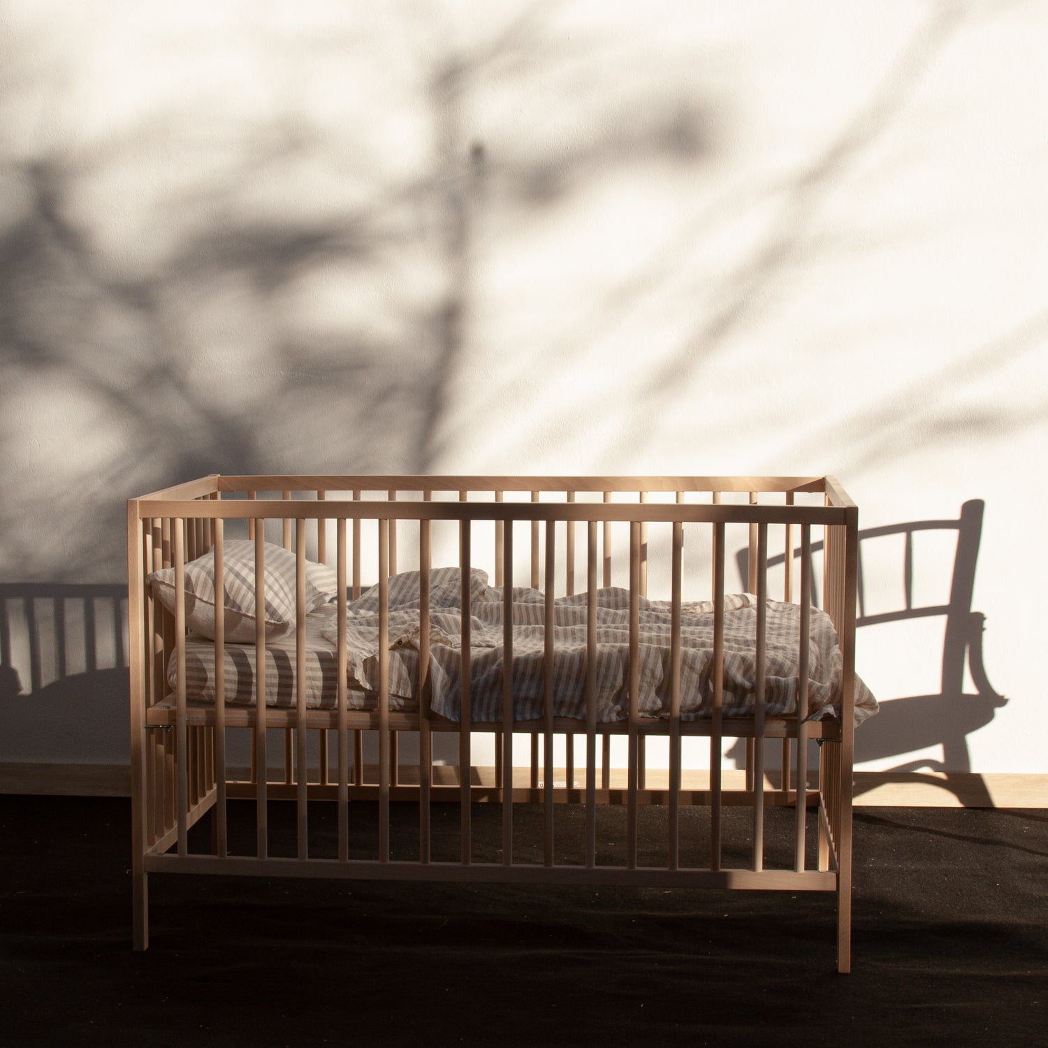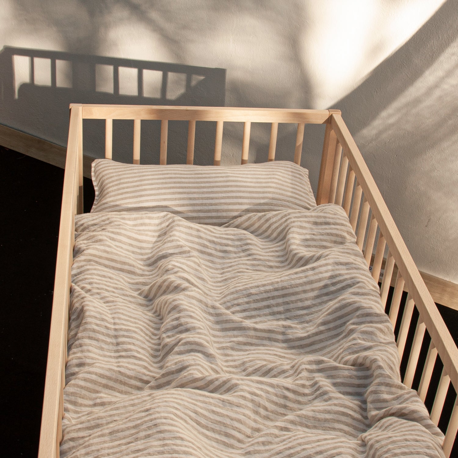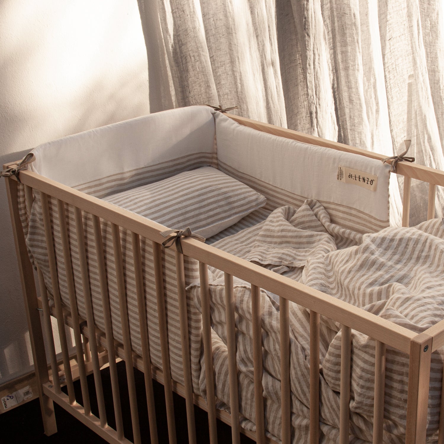 La colección Colette para cunas está confeccionada con un lino suave de un gramaje medio (190gr) que puedes lavar hasta 40°C, usar secadora y no necesita planchado.