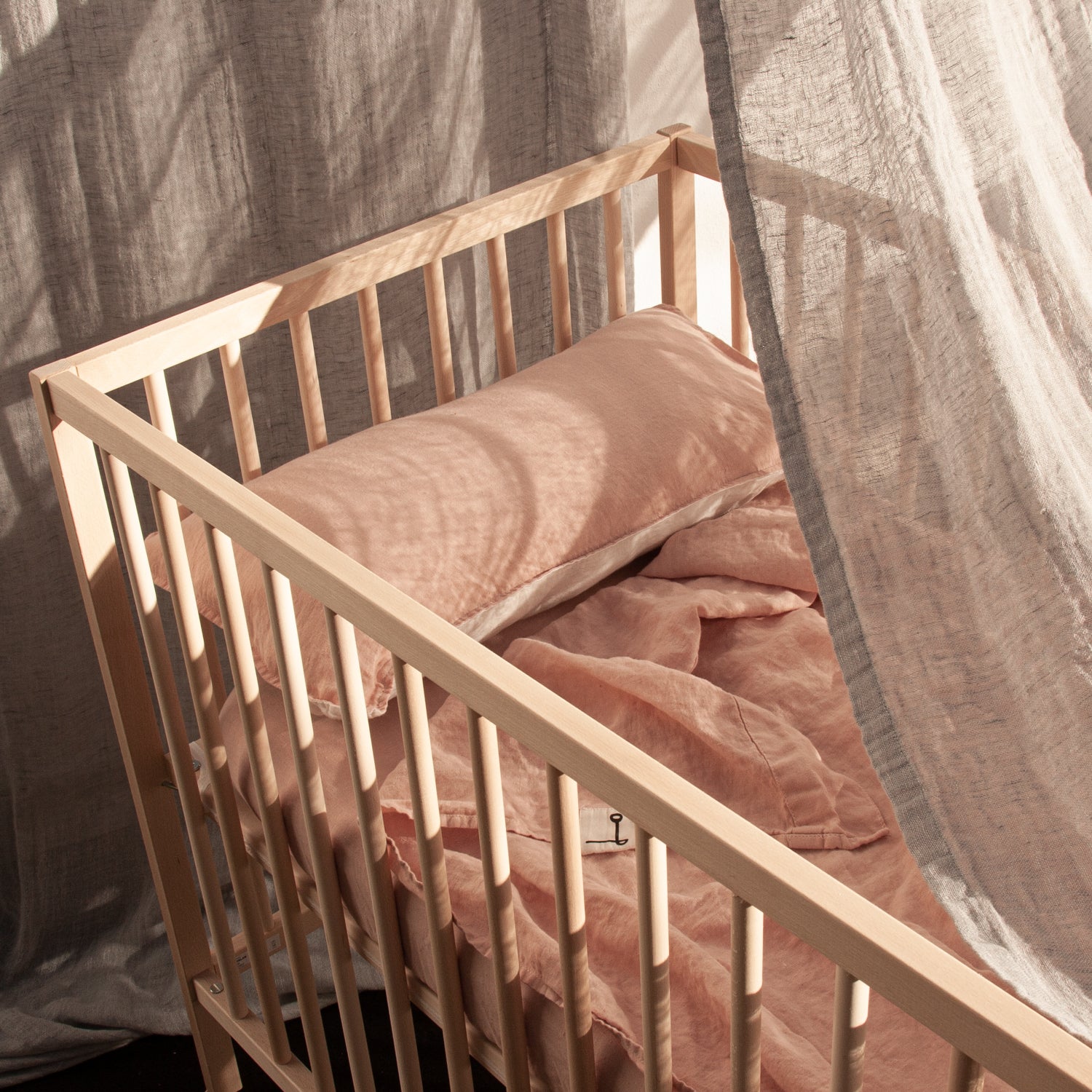 Mafalda es un amor, con su color rosa dulce, empolvado, combinado con el blanco roto del lino. Con una onda bella y natural que arropa los sueños de tus hijos dándoles bienestar.