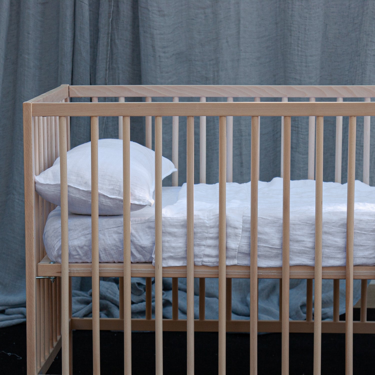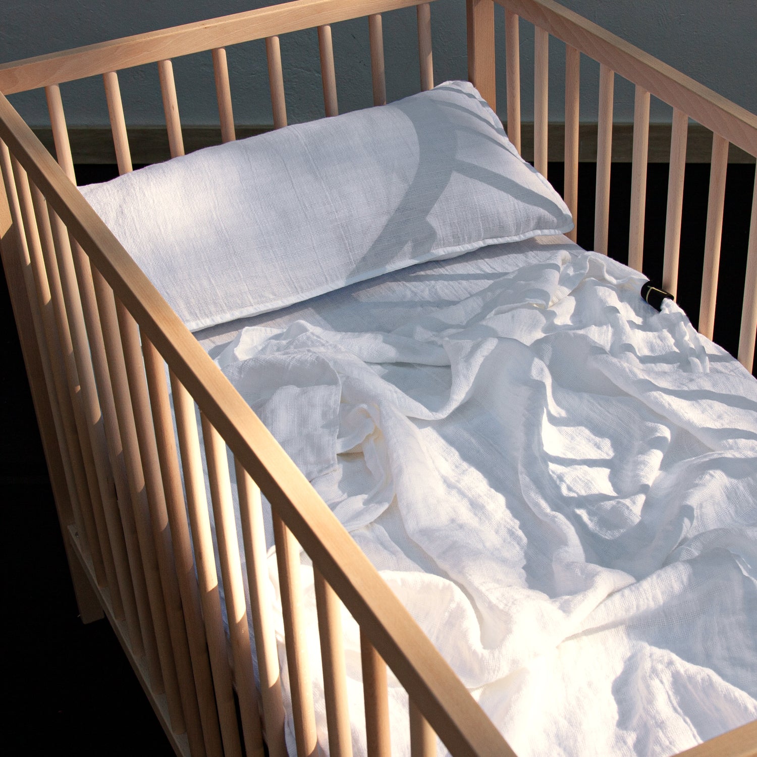 Juego de sábanas con funda de almohada para cuna 100% lino lavado en color blanco. Este modelo es muy dulce, es un básico super especial, único y muy diferente. Con un gramaje medio de 190gr este lino arropará su piel sin dejar que pase calor gracias a las propiedades termo reguladoras del lino.