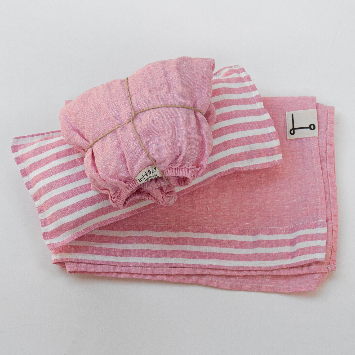 Juego de sábanas para mini cuna o capazo hecho con 100% lino lavado. El tono del modelo Gretel nos recuerda al color de un chicle, de esos que tenían muchísimo sabor y que nos tomábamos a la salida del colegio....¡Cómo pasa el tiempo!