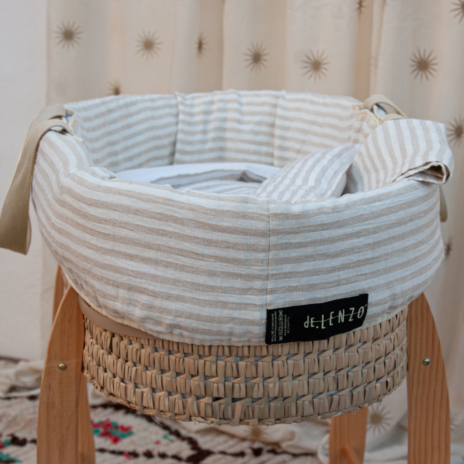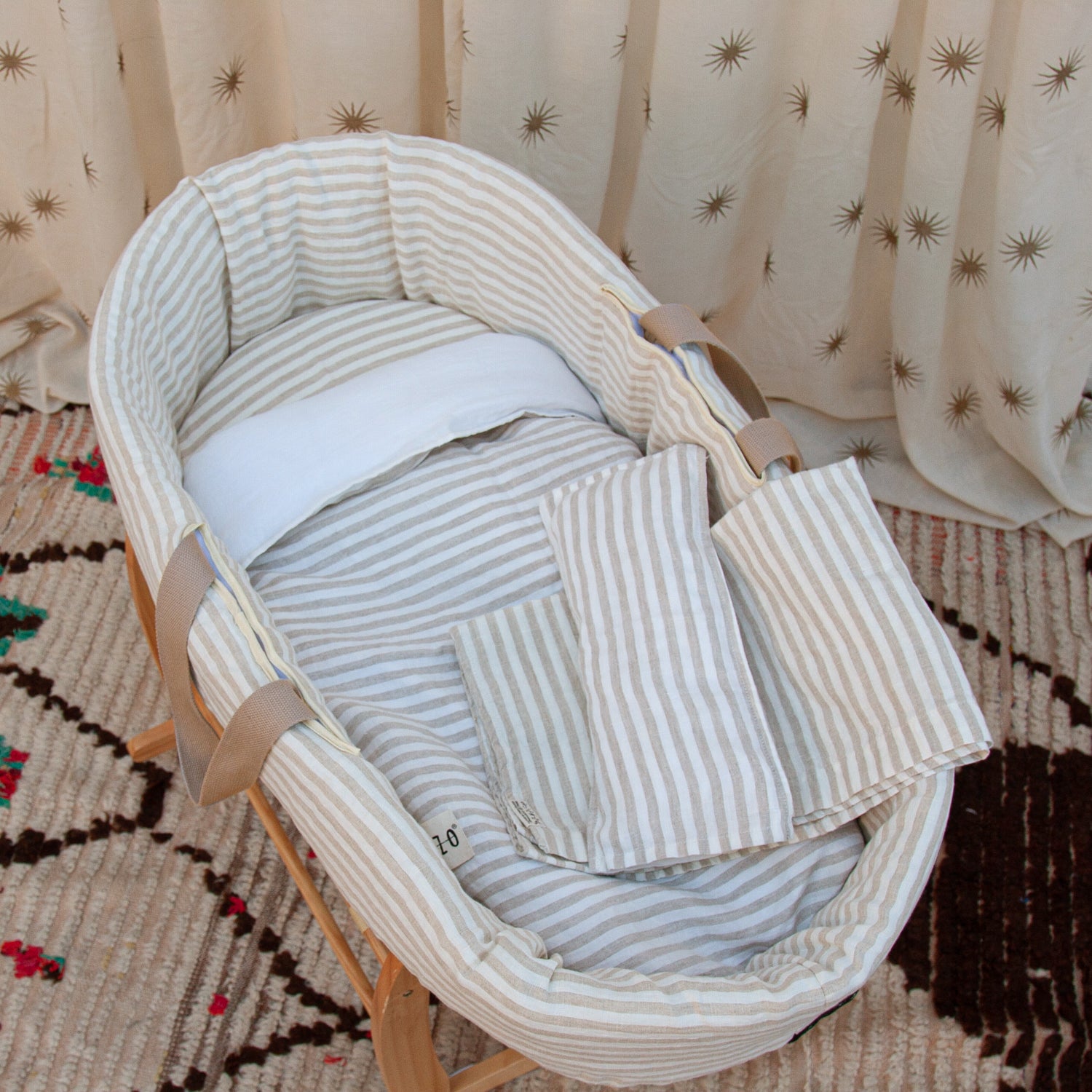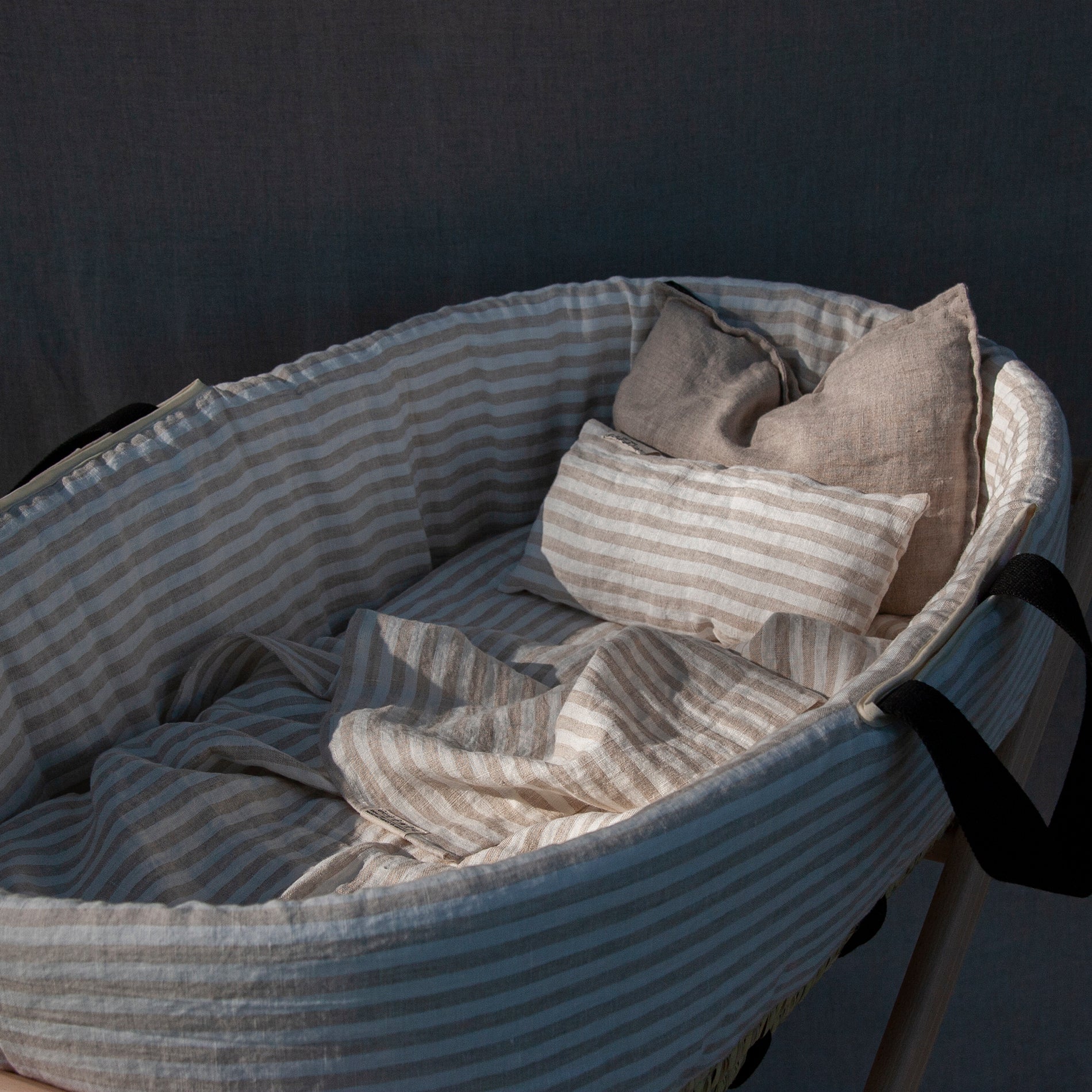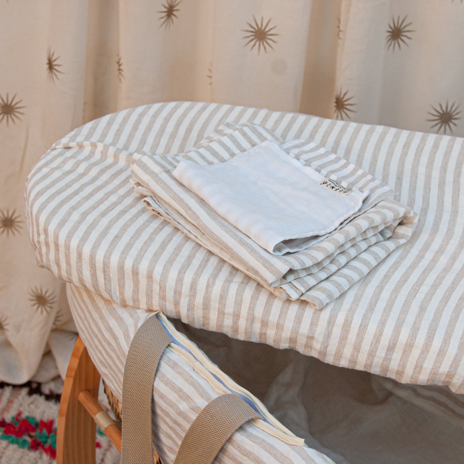 Ropa infantil para moisés hecha con 100% lino lavado de origen europeo, cuenta con el sello STANDARD 100 by OEKO-TEX® garantía de un proceso de fabricación certificado y controlado, respetuoso con tu piel.
