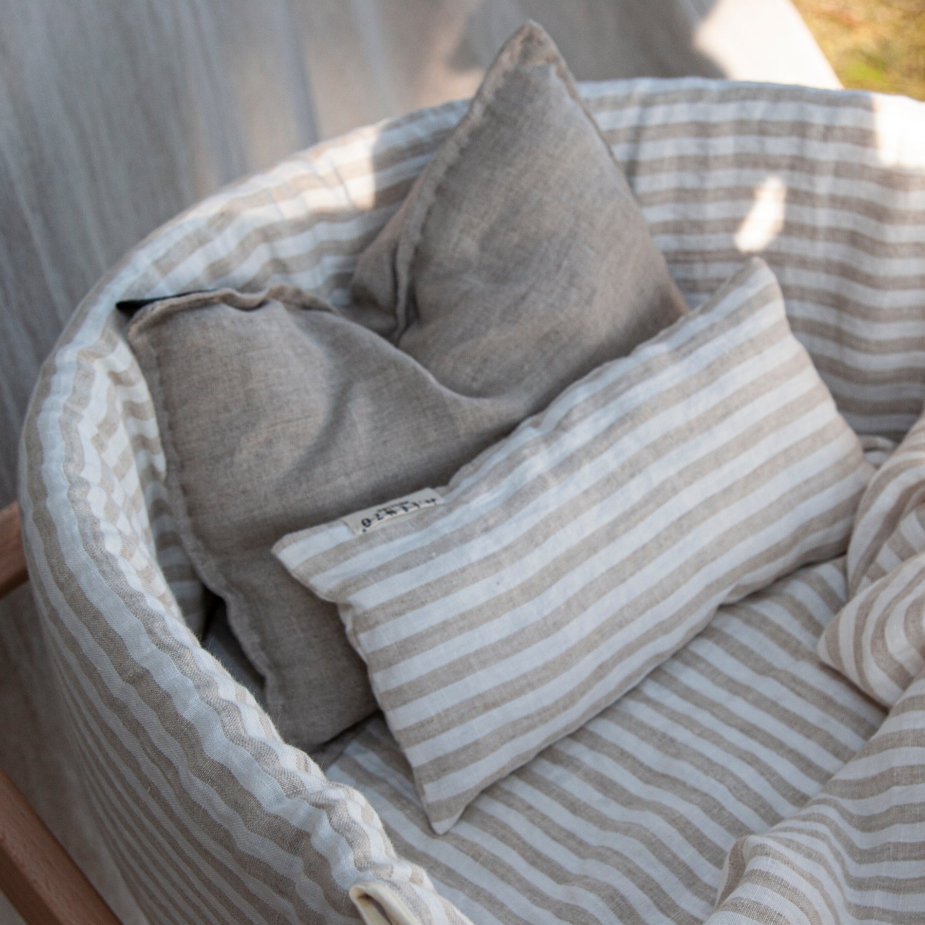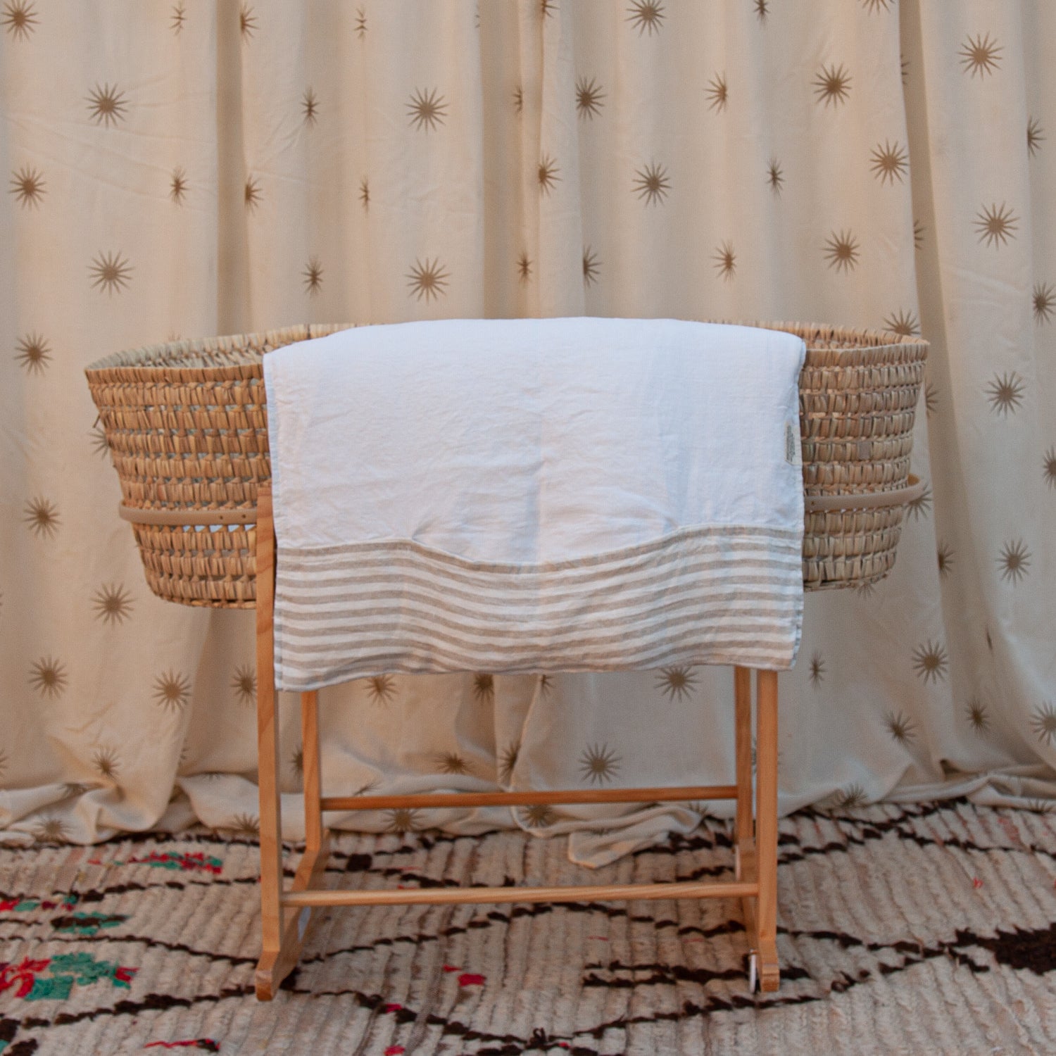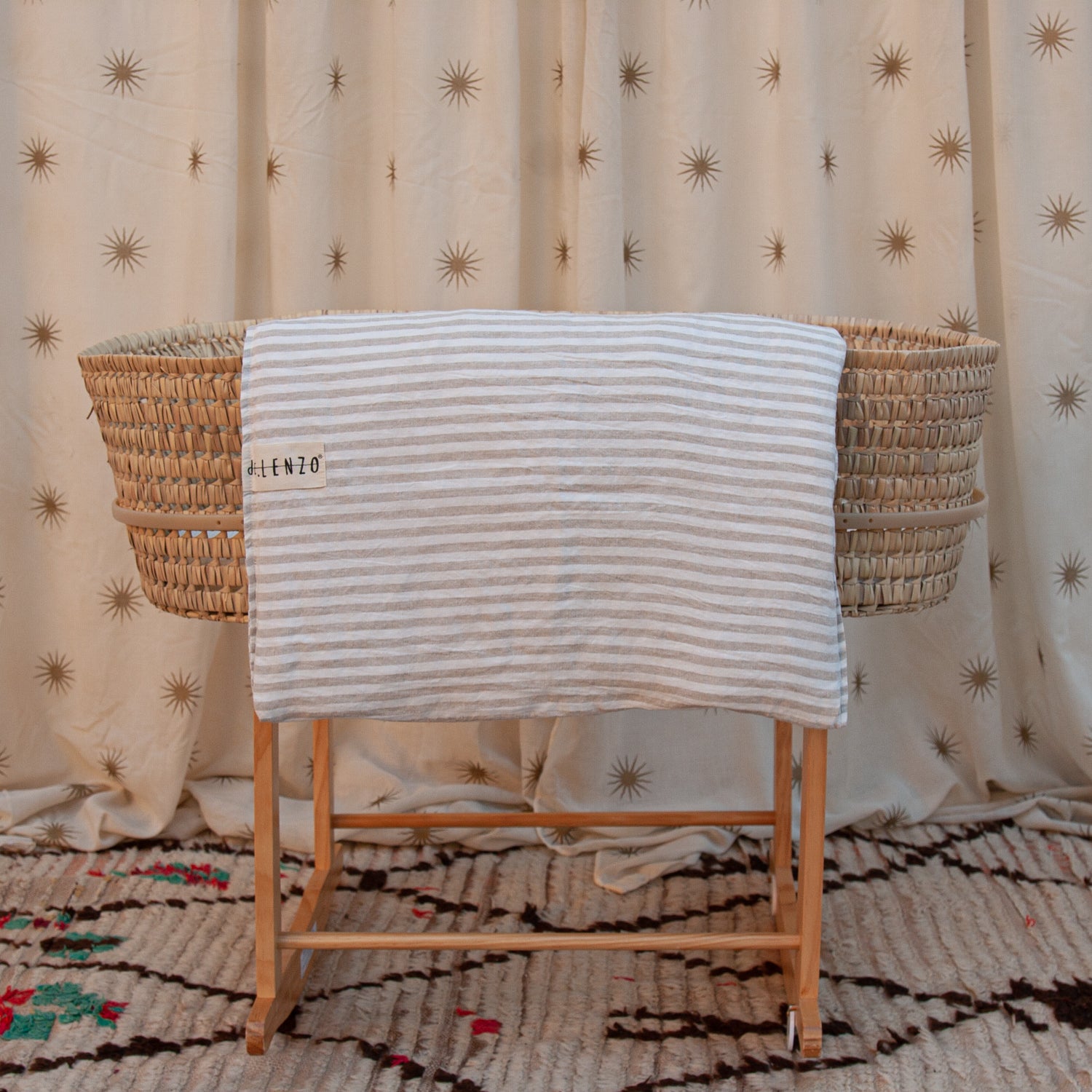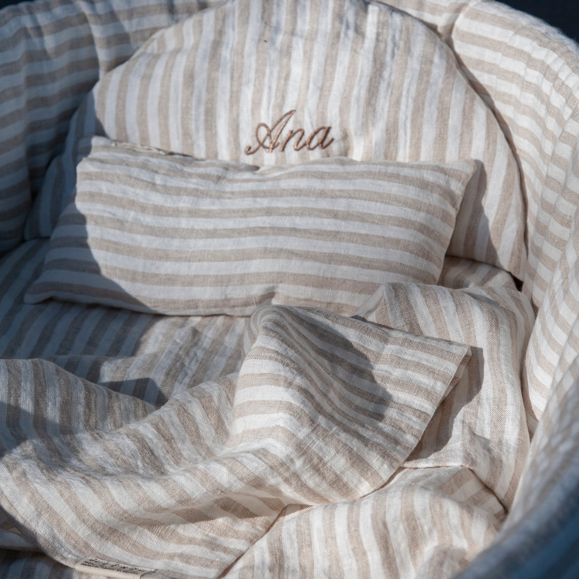 Ropa infantil para moisés hecha con 100% lino lavado de origen europeo, cuenta con el sello STANDARD 100 by OEKO-TEX® garantía de un proceso de fabricación certificado y controlado, respetuoso con tu piel.
