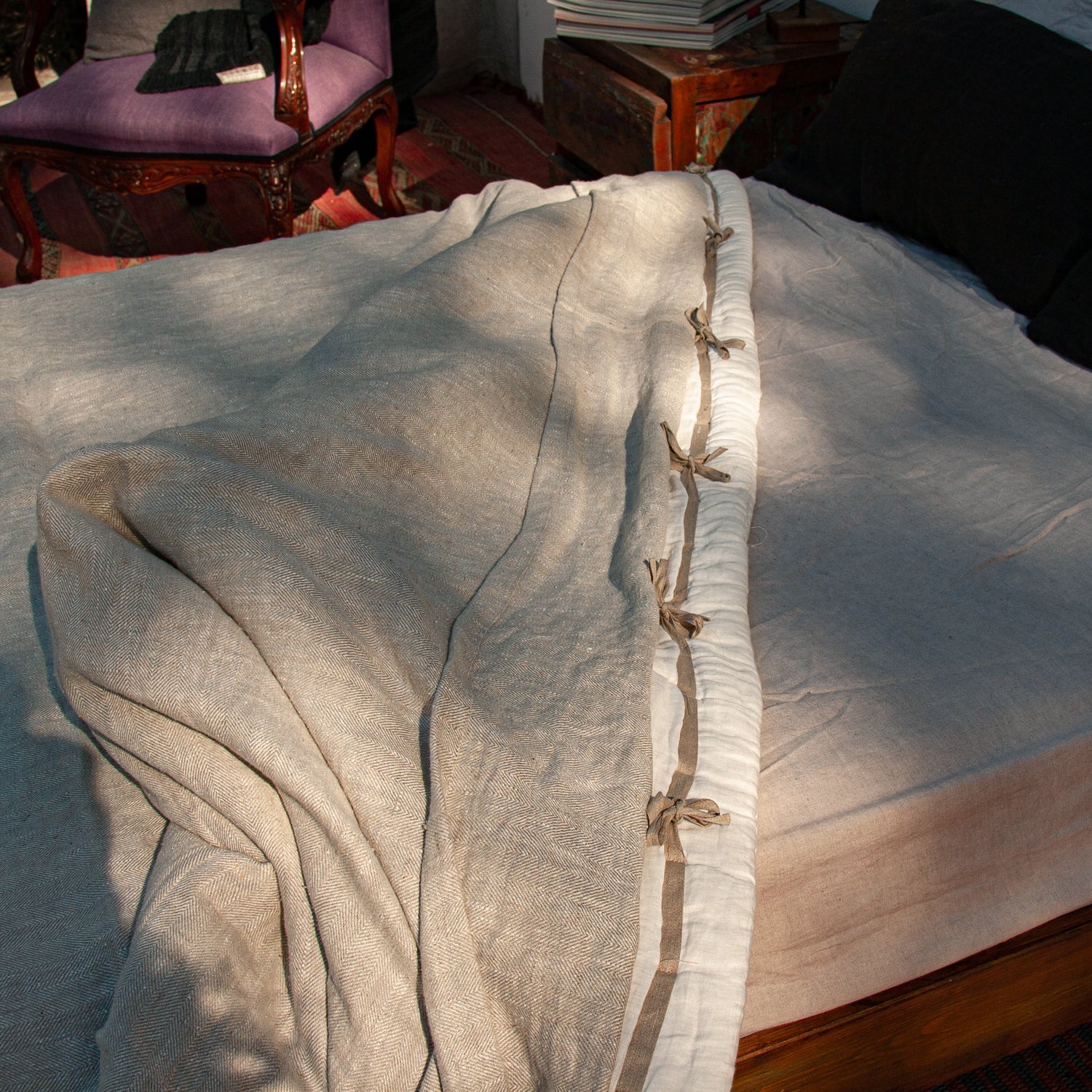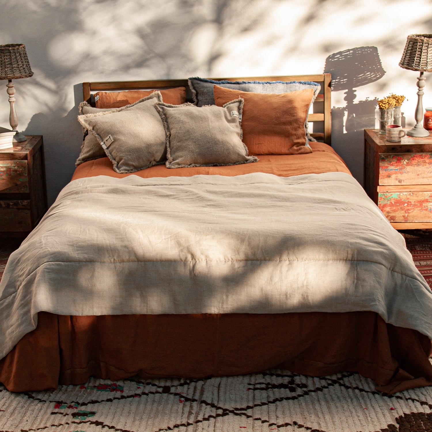 Puedes acompañarlos con las colchas Jaipur pues el sistema de lazos permite que lo tengas sujeto a tu colcha pero lo ideal es completarlo con una funda nórdica de lino que en estos casos confeccionamos con doble cremallera para una abertura que permita con comodidad poner tu relleno.
