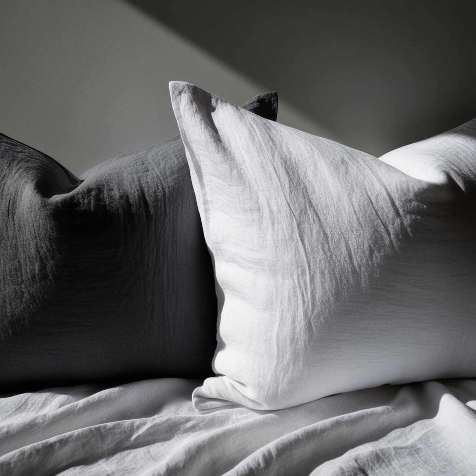 Funda nórdica, fundas de almohada y sábana bajera ajustable de lino lavado gris & blanco. Puedes elegir el tono de bajera que prefieras.