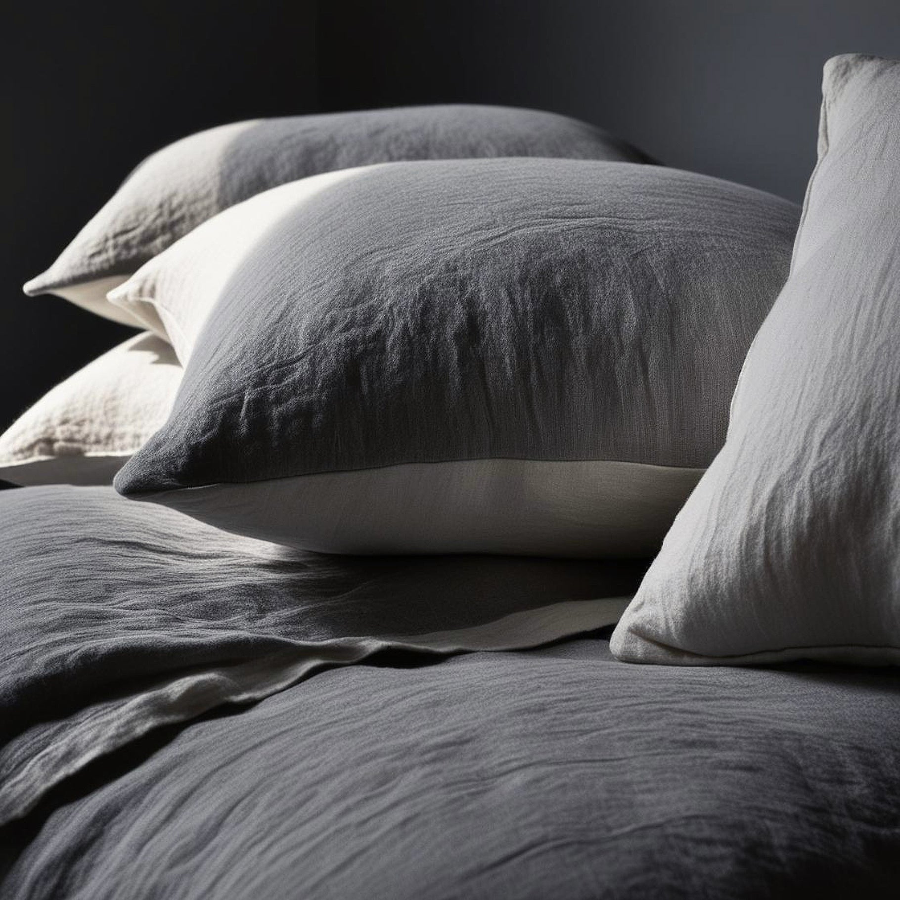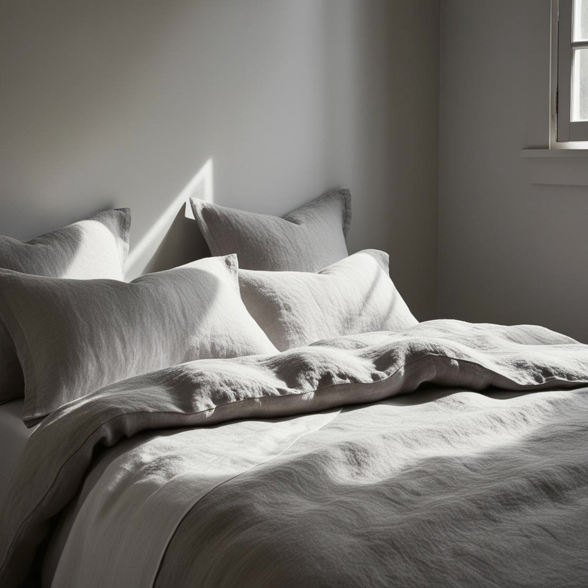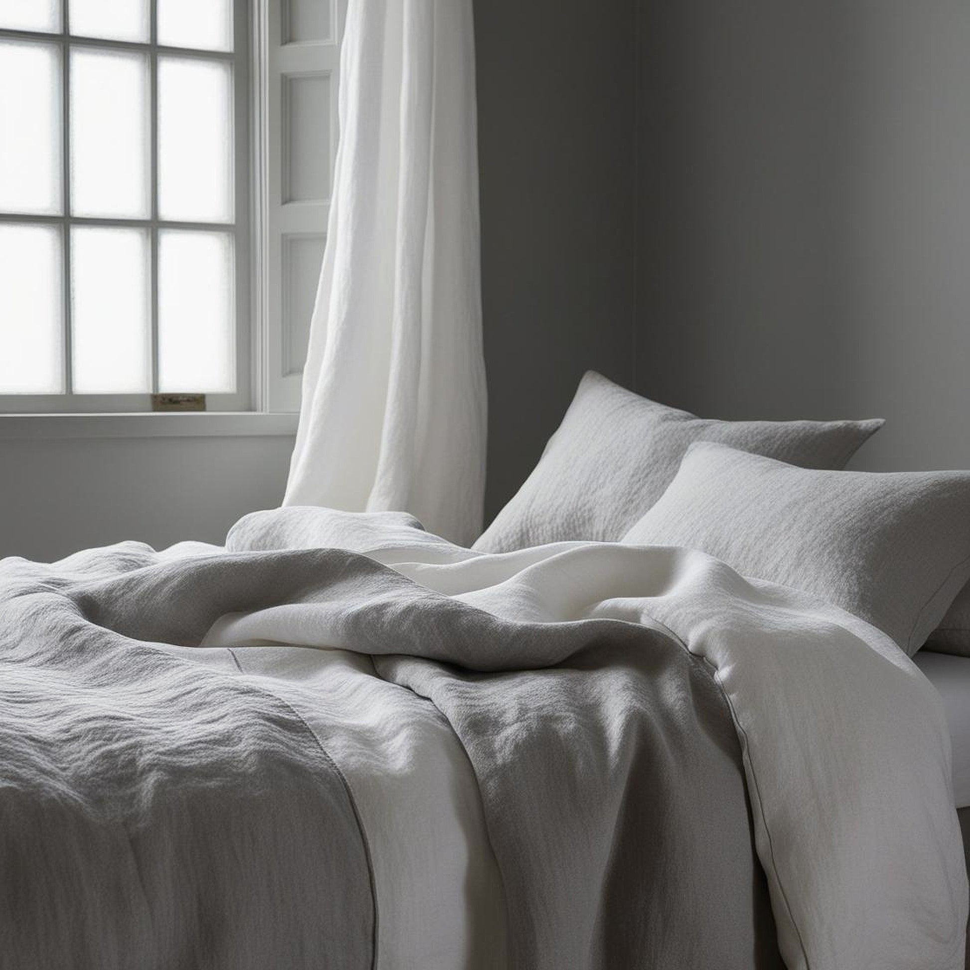 Juego de funda nórdica de lino bicolor gris claro y blanco, fundas de almohada bicolor y sábana bajera Gris o blanca ajustable, todo de lino lavado. Puedes añadirle un repulgo del mismo color a las almohadas.