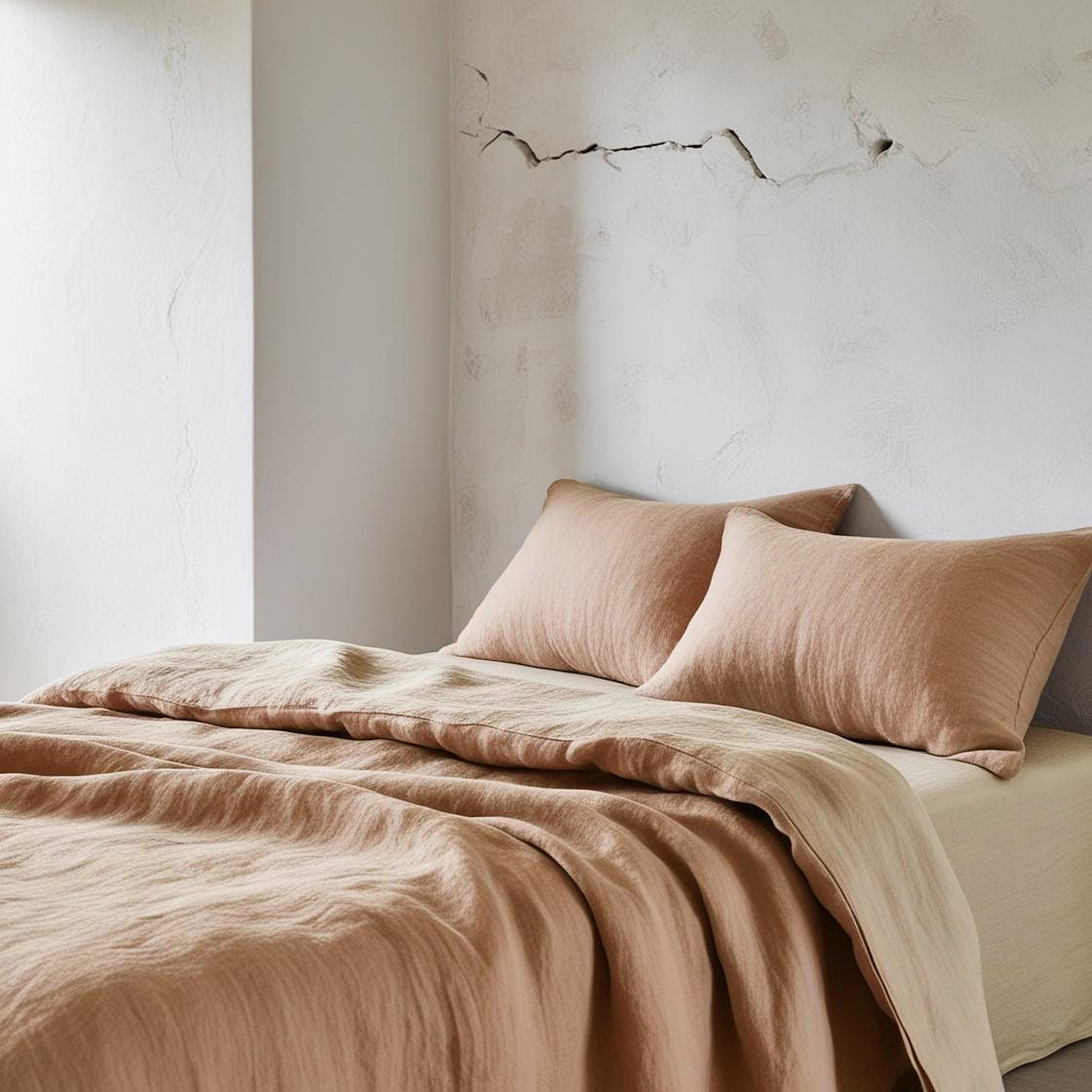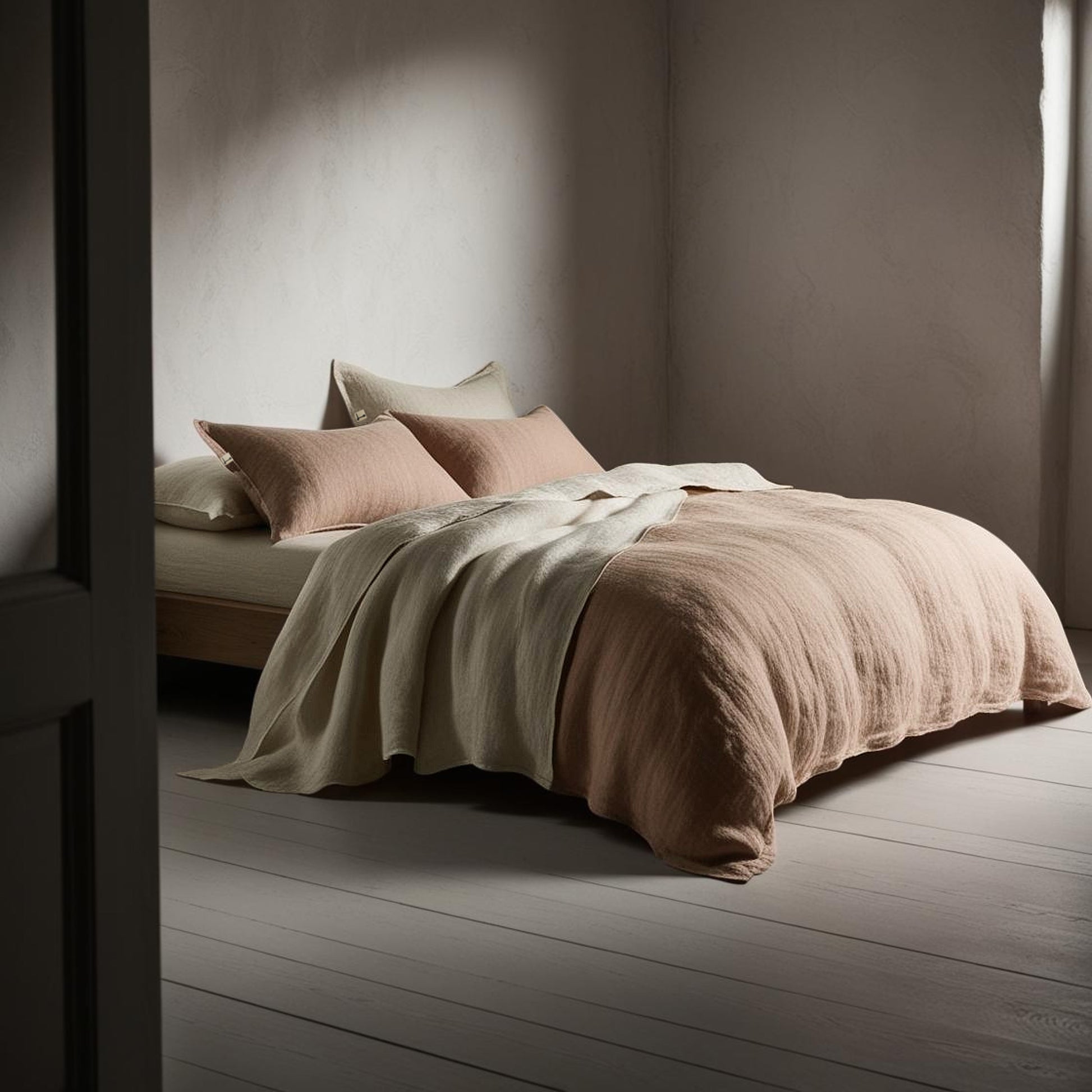 Lino lavado extra suave; Rosa melocotón, con un toque salmón. Ideal para darle luz a tu cama. Puedes elegir la bajera en uno de los dos colores. Ambos de 190gr/m2. El lino perla hace que este bicolor sea más cálido.