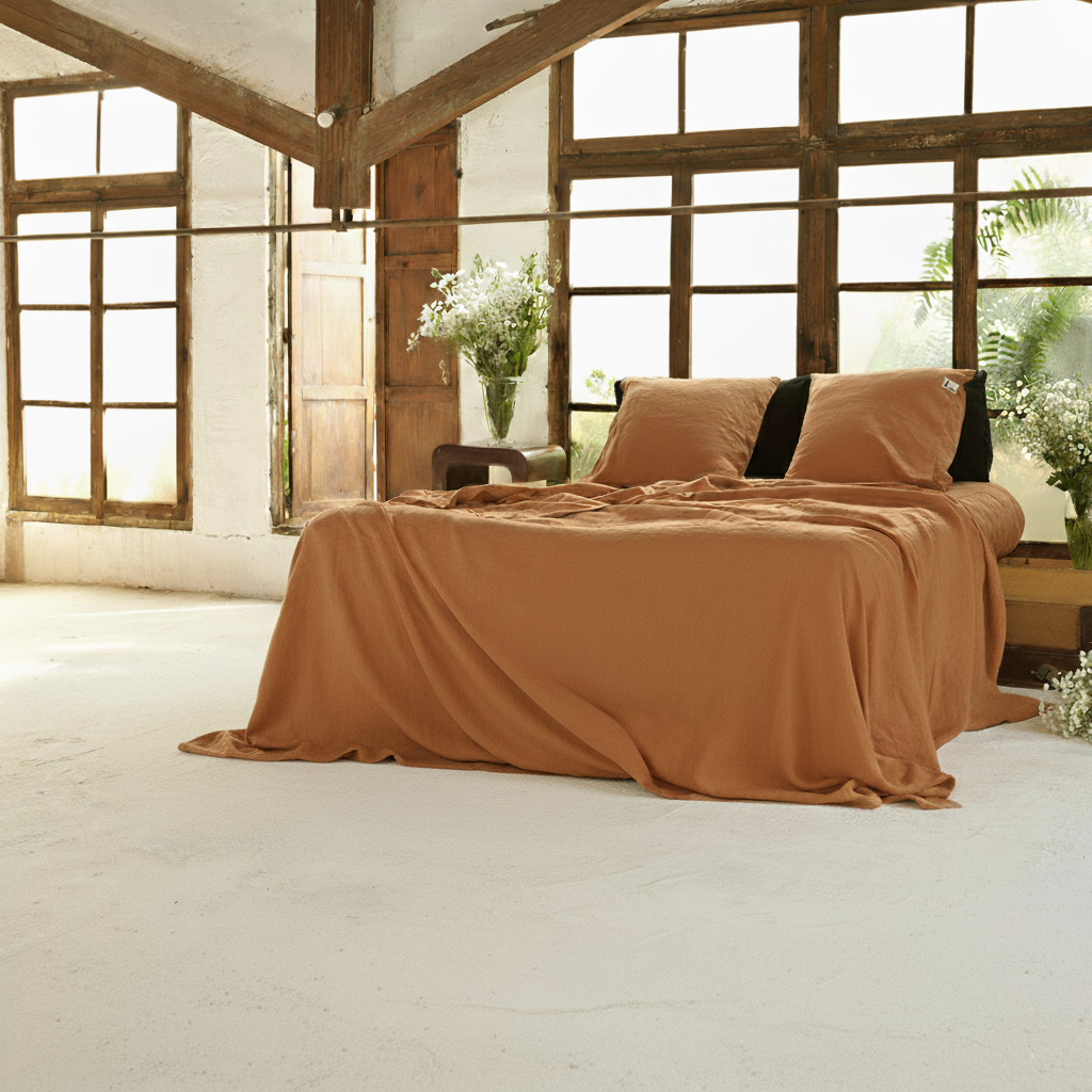 Juego de sábanas de 100% lino color teja rustic , lino lavado. Una elección muy buena para combinar con una funda nórdica del mismo tono teja o ideal para verdes, naturales, negros...