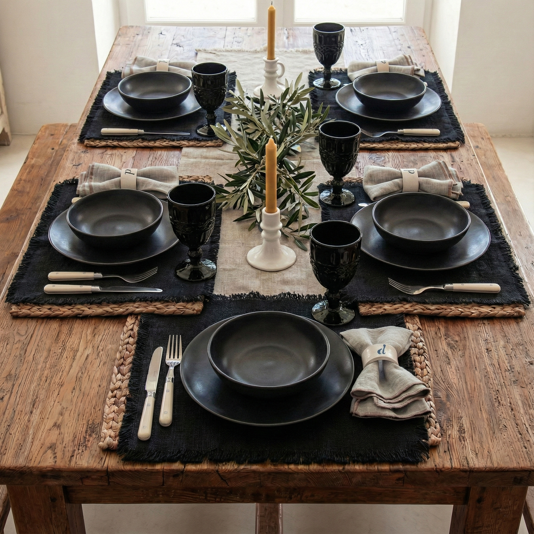 Mantelitos individuales desflecados o con doblez de 350gr/m2 de 40x0cm. En color natural, negro, blanco o gris. Pareja perfecta de las servilletas Marrakech o todas nuestras servilletas de colores. También hacemos medidas especiales.