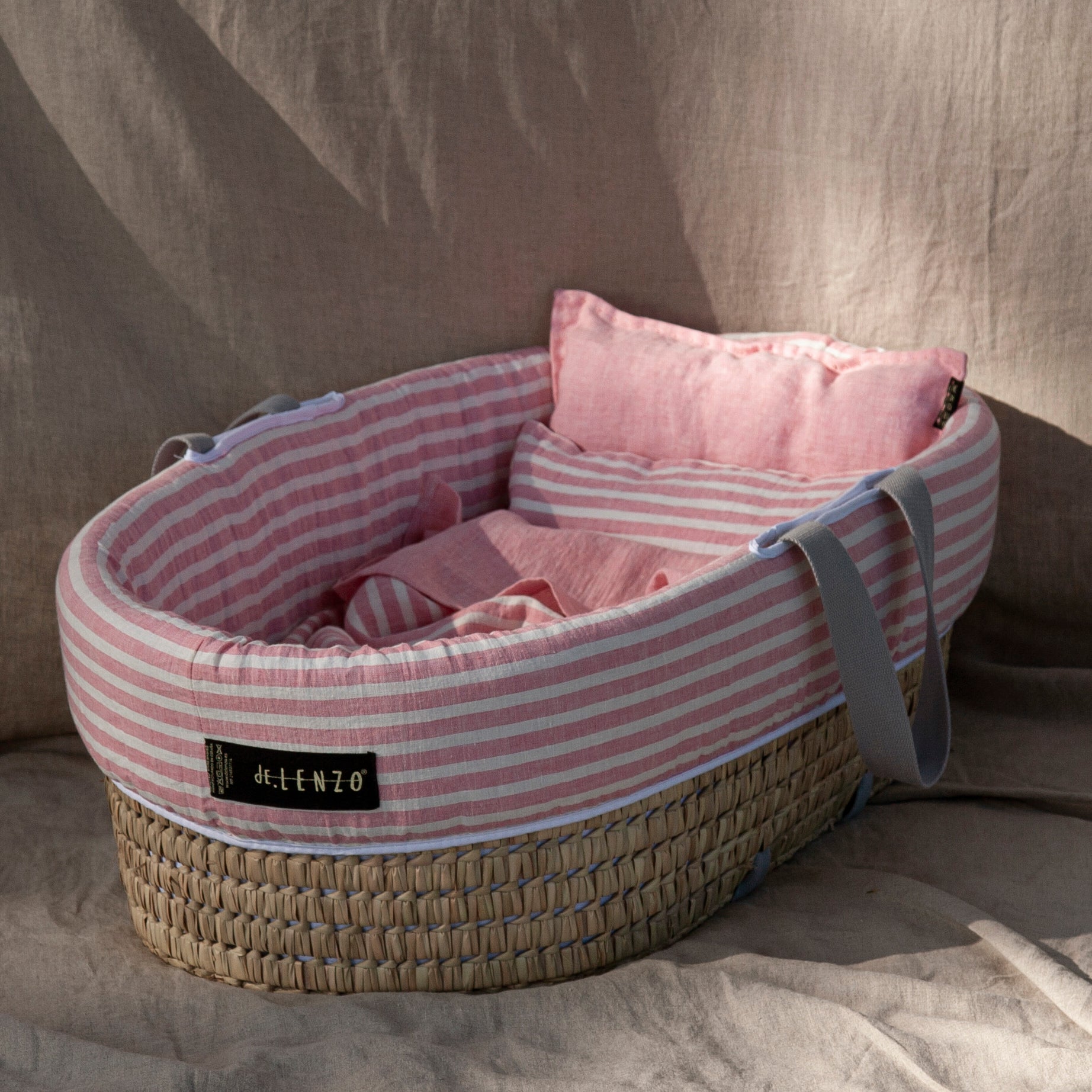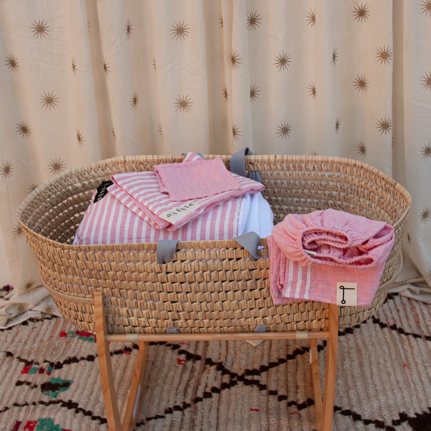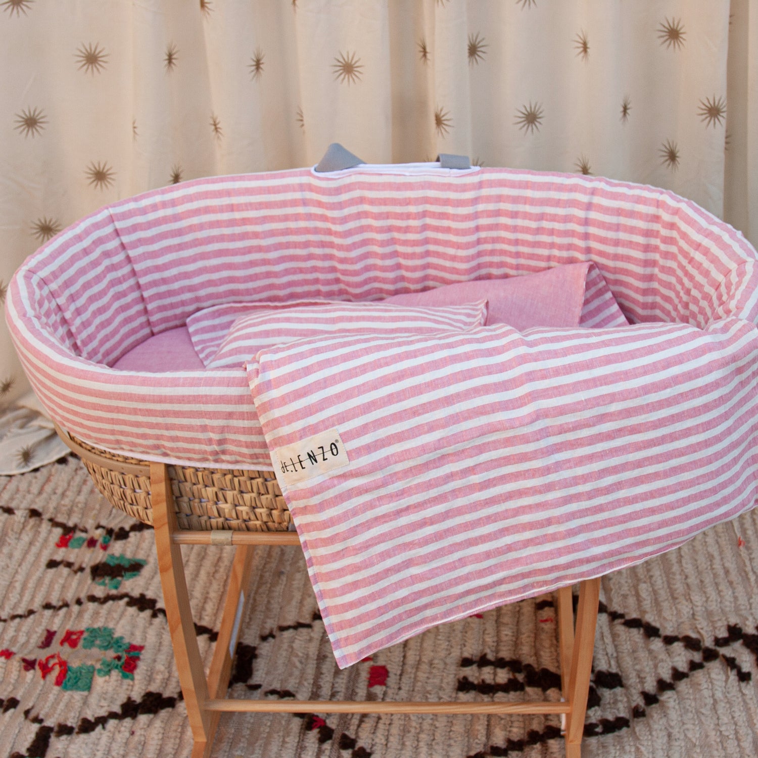 Este capazo es increíblemente alegre. Con su rosa chicle inspira felicidad donde lo pongas. Un lino suave con cuerpo y un gramaje ideal para bebé. Elige entre moisés completo o únicamente las vestiduras para el moisés, aptas para secadora y no necesitan planchado. La ropa de moisés la podrás utilizar con tu mini cuna por su tamaño.