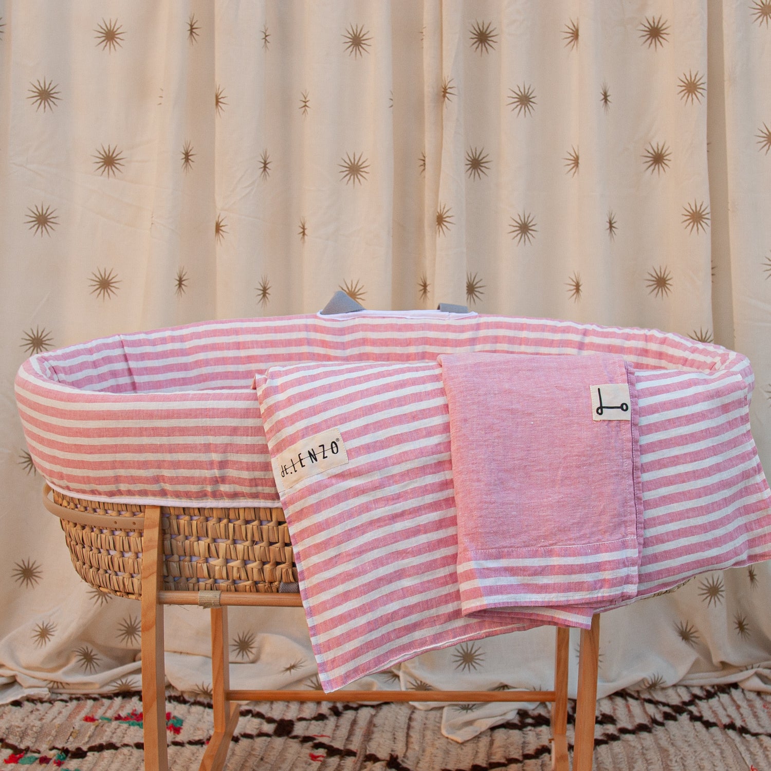 Ropa infantil para moisés hecha con 100% lino lavado de origen europeo, cuenta con el sello STANDARD 100 by OEKO-TEX® garantía de un proceso de fabricación certificado y controlado, respetuoso con tu piel.