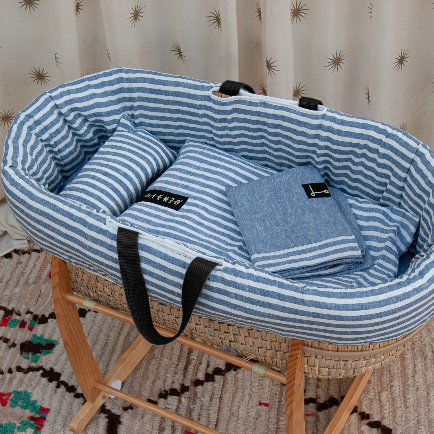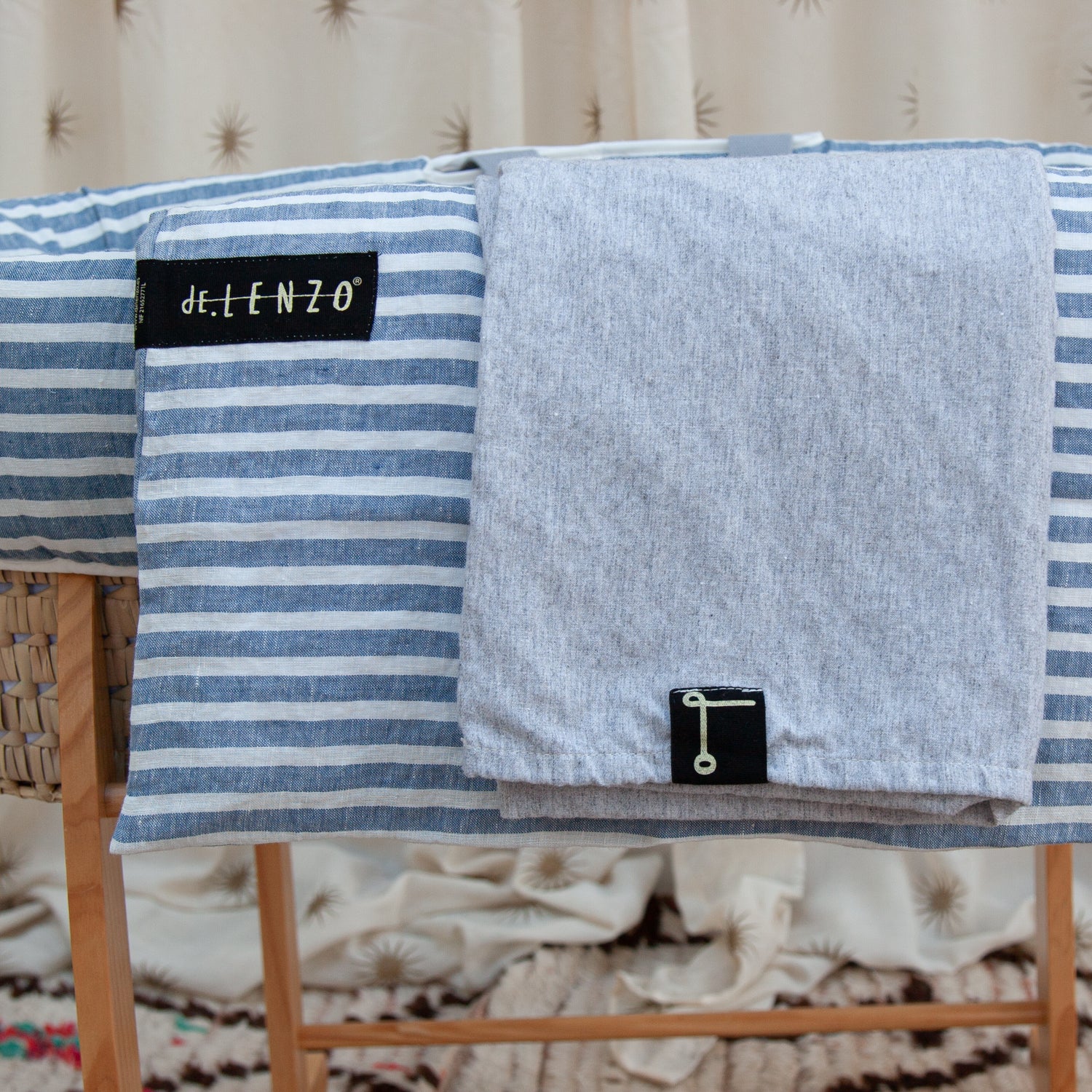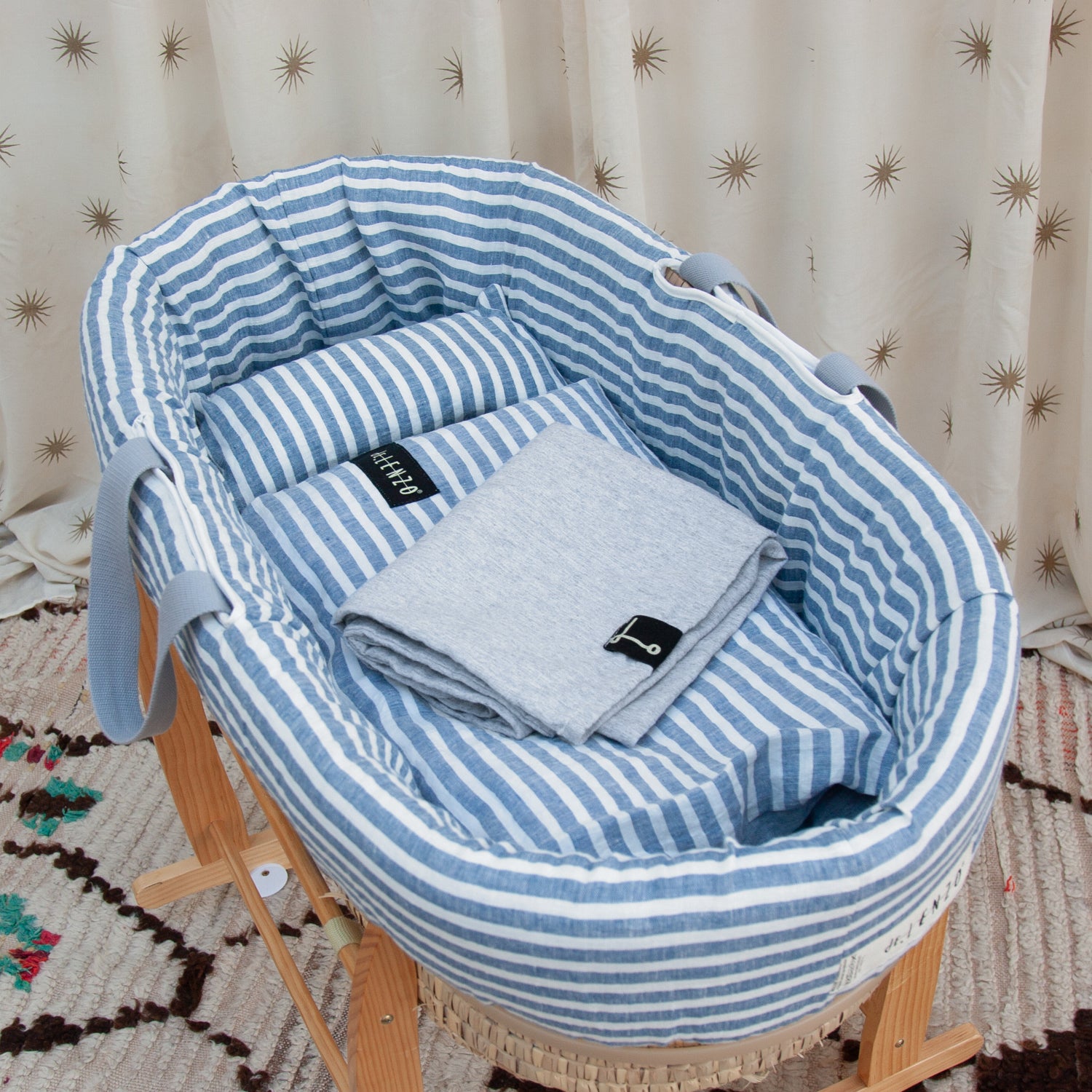 Ropa infantil para moisés hecha con 100% lino lavado de origen europeo, cuenta con el sello STANDARD 100 by OEKO-TEX® garantía de un proceso de fabricación certificado y controlado, respetuoso con tu piel.