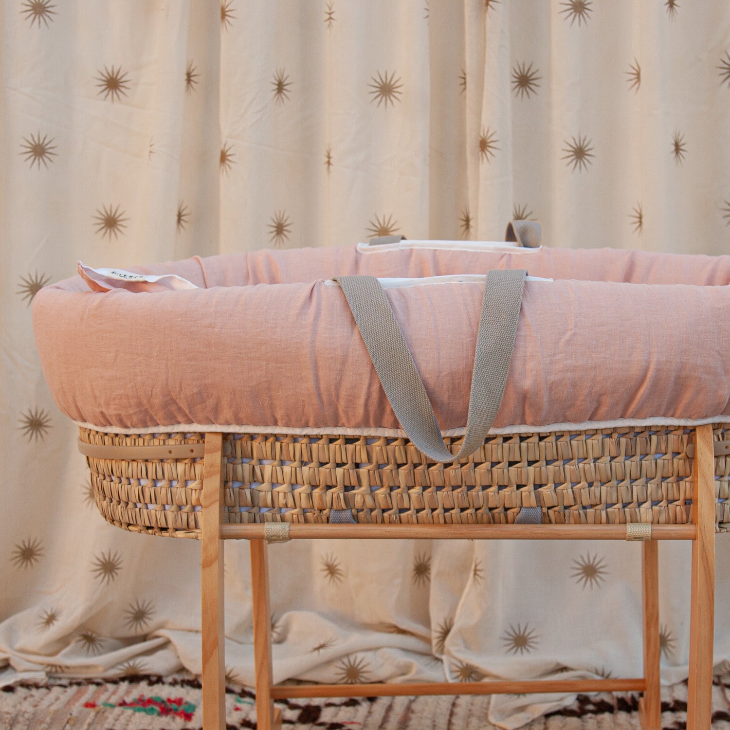 Ropa infantil para moisés hecha con 100% lino lavado de origen europeo, cuenta con el sello STANDARD 100 by OEKO-TEX® garantía de un proceso de fabricación certificado y controlado, respetuoso con tu piel.