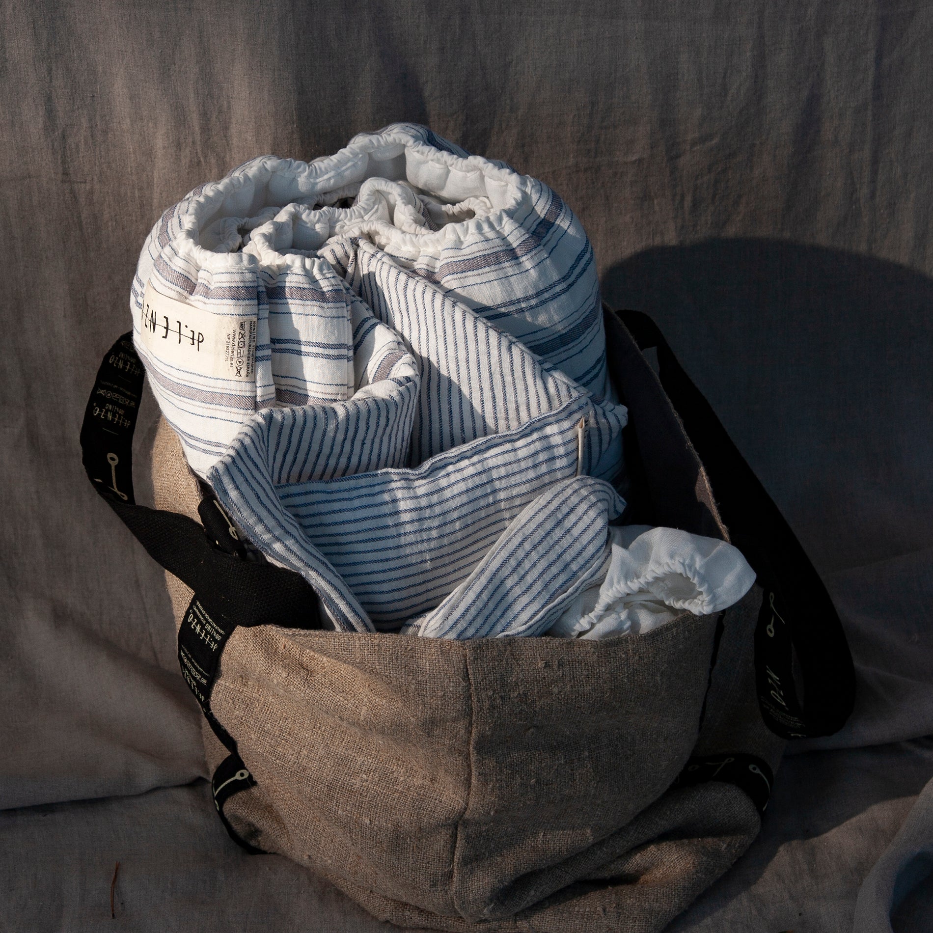 Algunos de nuestros cojines, están cosidos con lino rústico de hasta 350gr/m2, y nuestras toallas con rizo de lino y base de algodón, exfolian tu piel de la forma más natural posible.
