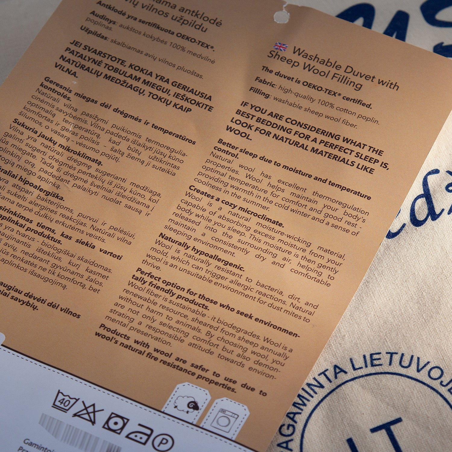 Relleno: Fibra de lana de oveja lavable - 250 g/m², 450 g/m²