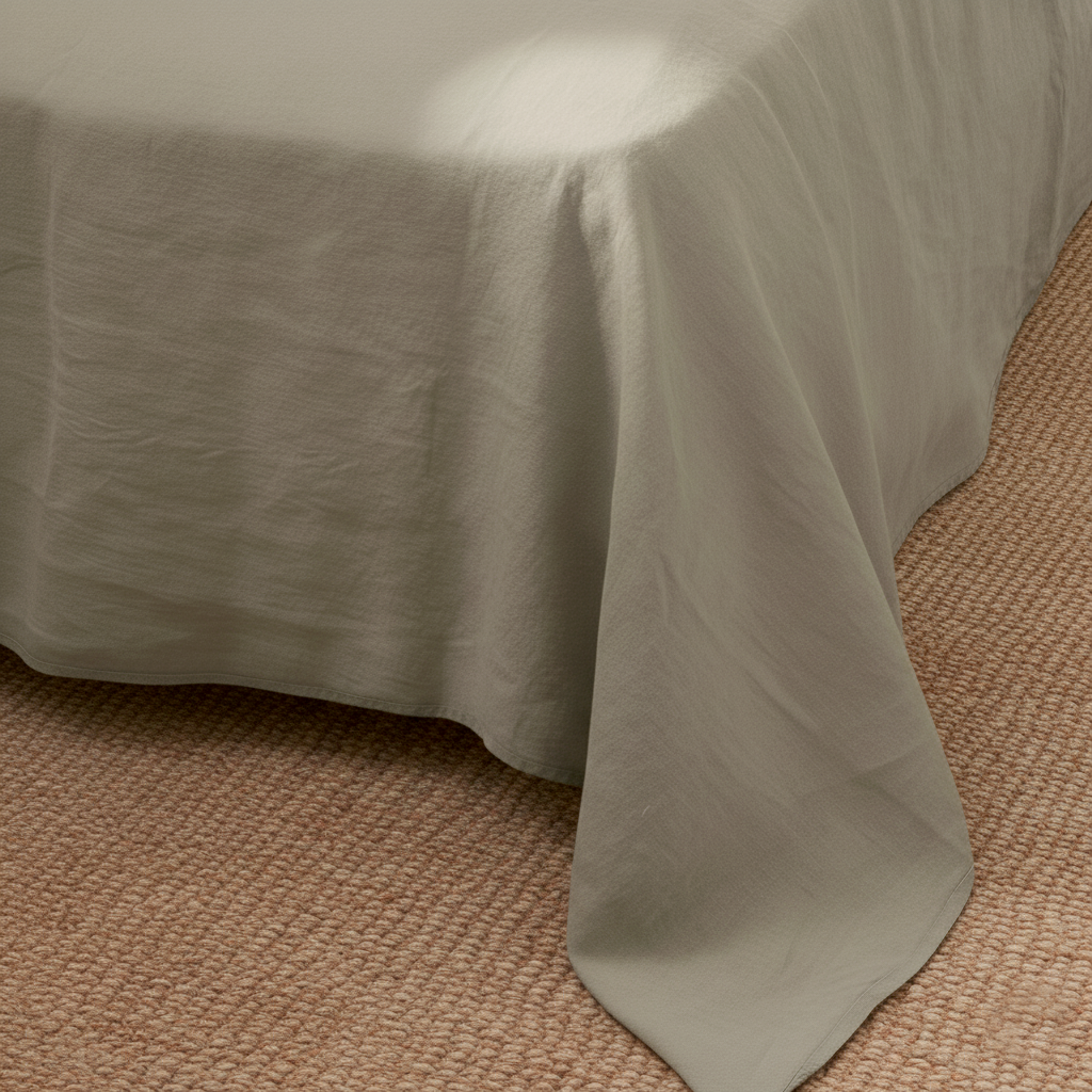Sábana encimera de lino lavado con amplio jaretón en la parte superior.